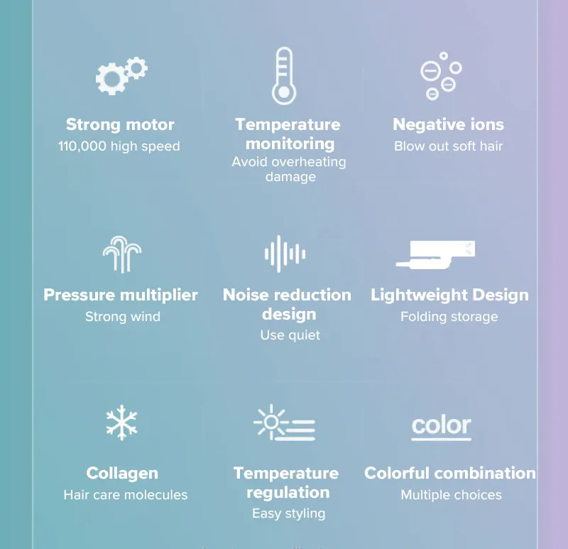 Ionic hair care, built-in ions, release a lot of ions during the hair blowing process, Smooth unwanted frizz and create shine on hair.