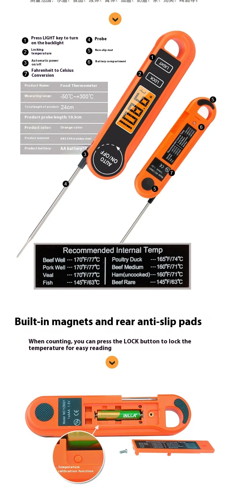 - Folding Stainless Steel Probe: Safe, portable, and easy to store.
