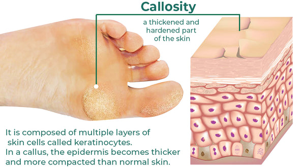 Repeated pressure or friction on particular parts of the foot leads to the development of calluses. The skin on the feet will thicken and stiffen in response to being rubbed or exposed to extreme force in order to defend itself. Uneven pressure distribution and calluses can also be brought on by abnormal foot mechanics, such as flat feet or high arches. Running or walking barefoot exposes the feet to unforgiving terrain, increasing friction and callus development.