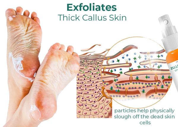 Natural plant extracts and botanicals with calming, healing, and exfoliating effects are the main focus of the key ingredients. The spray composition makes application simple and precise. The liquid form of the spray makes it easier to penetrate calloused skin and delivers active ingredients to soften and exfoliate the hardened skin cells when applied to the afflicted region.