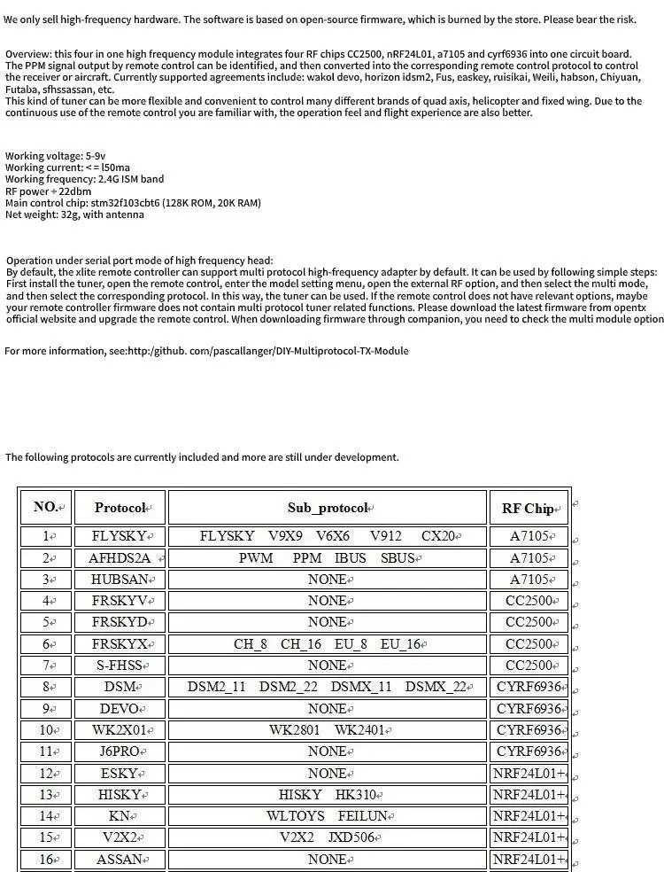 The Four-in-One Multi-Protocol Tuner is a versatile, high-performance device designed for professionals and hobbyists in the world of radio communication and wireless technologies. With the ability to support multiple communication protocols, this tuner is a must-have tool for those looking to streamline their setup and enhance their device performance. Whether you're an enthusiast of radio-controlled vehicles, drone racing, or wireless communication systems, this tuner is designed to simplify your experience with its multi-protocol compatibility, allowing you to tune and control a wide range of devices with ease.