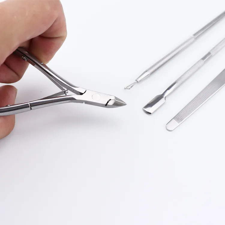 - Gently trim dead skin and cuticles using the appropriate scissors from the set.