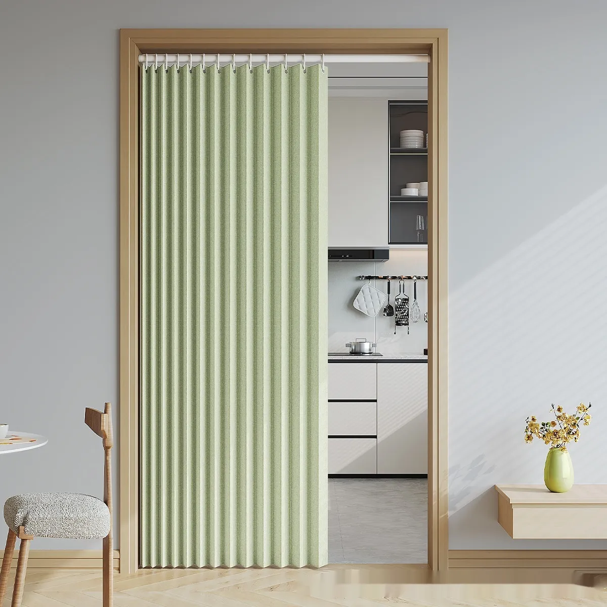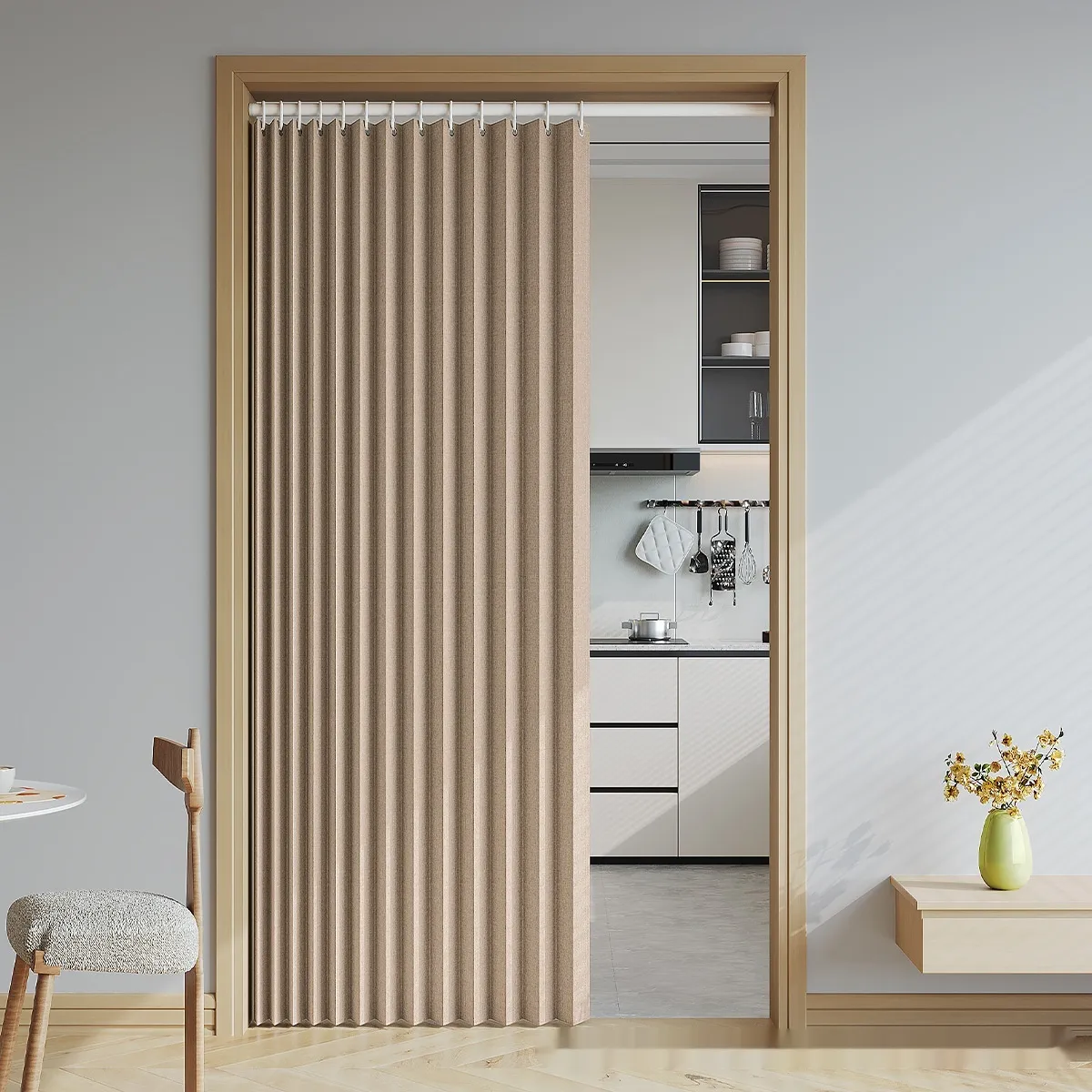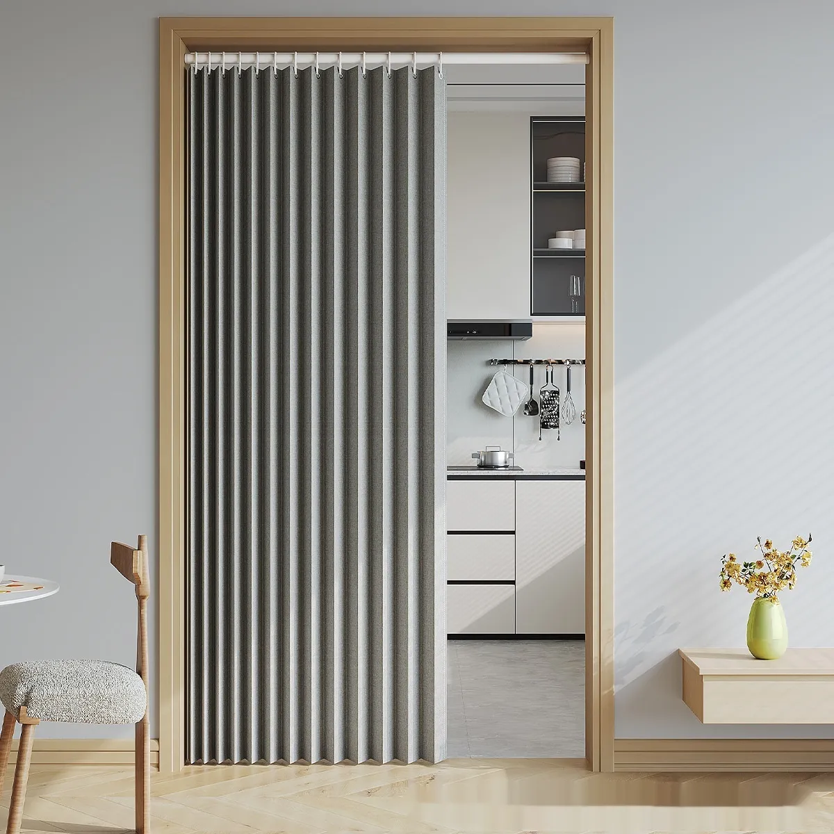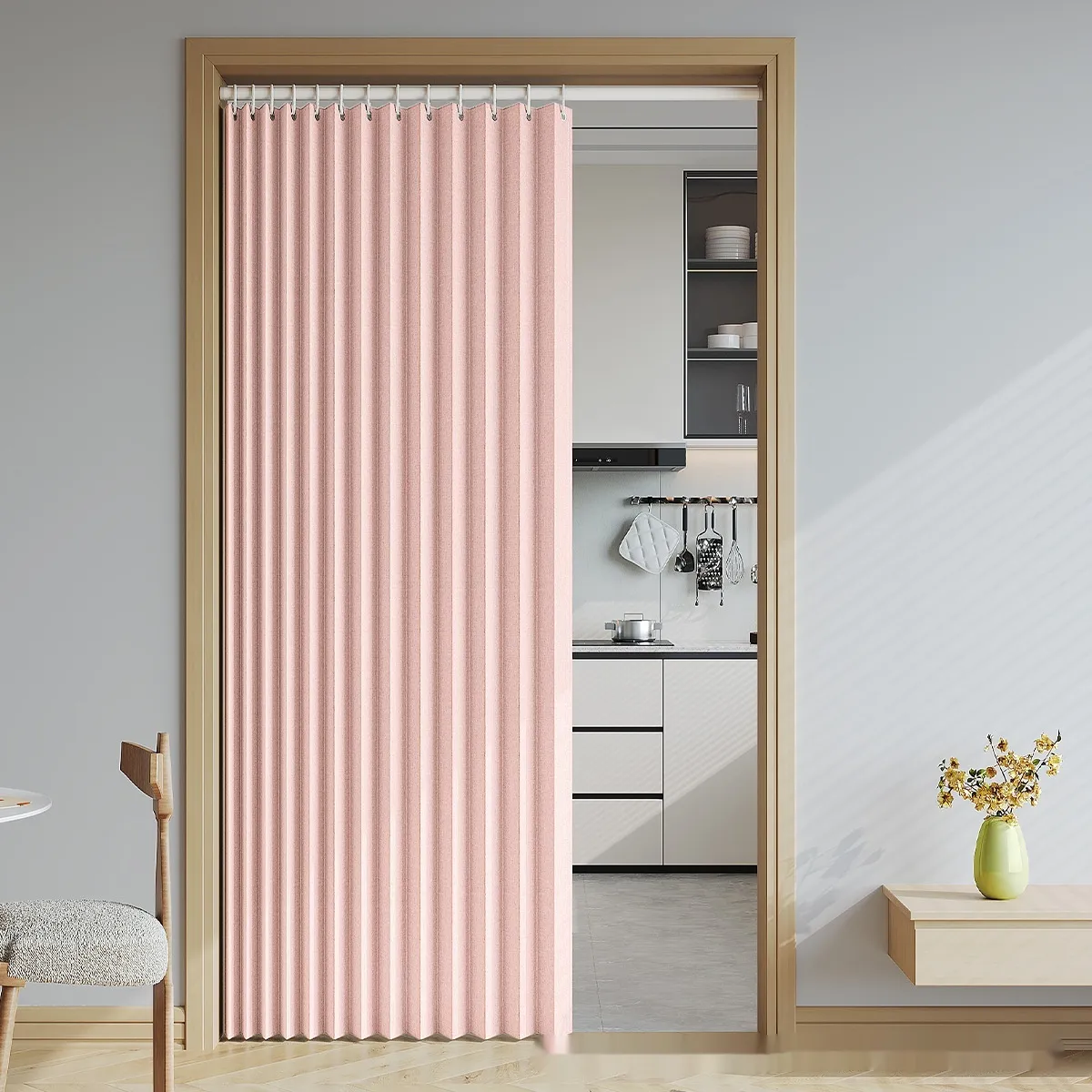 vibrant shades or textured fabrics, the curtain material can enhance the aesthetic of your room. The sleek design of the divider complements