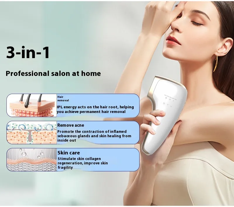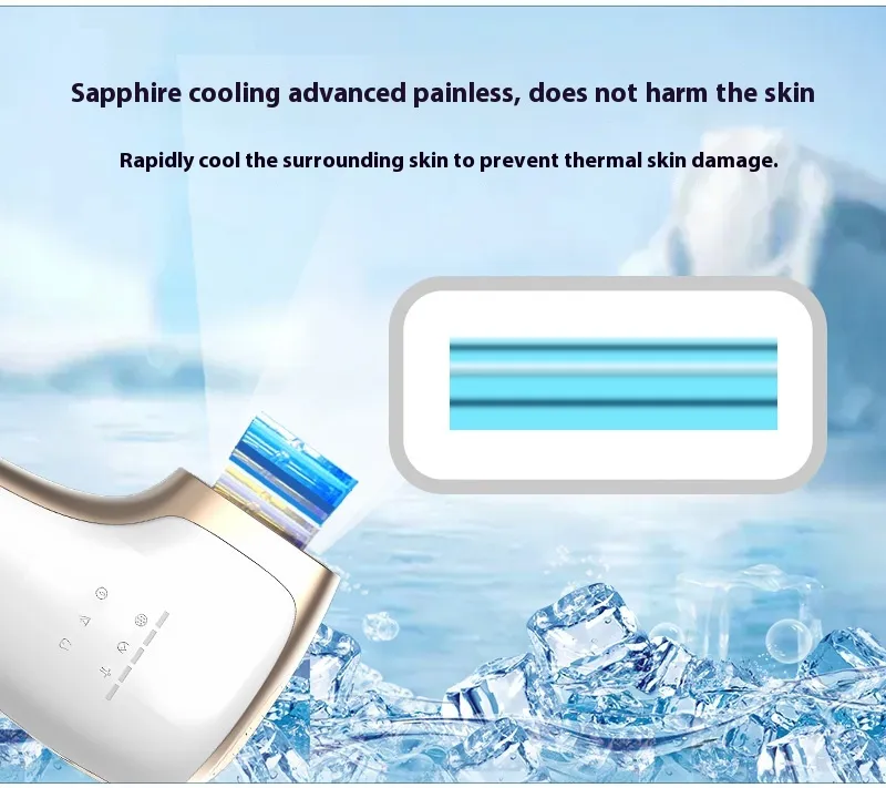 Painless Hair Removal: Utilizes cooling sapphire technology to numb the skin during the process, offering a virtually