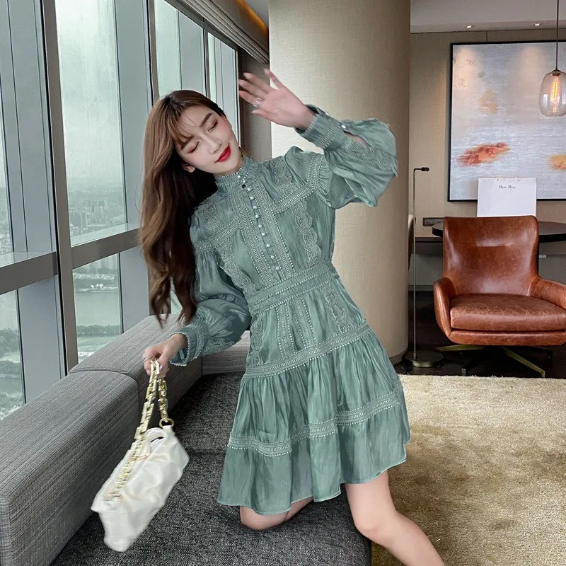 French Light Luxury Puff Sleeve High Waist Slim Midi Dress