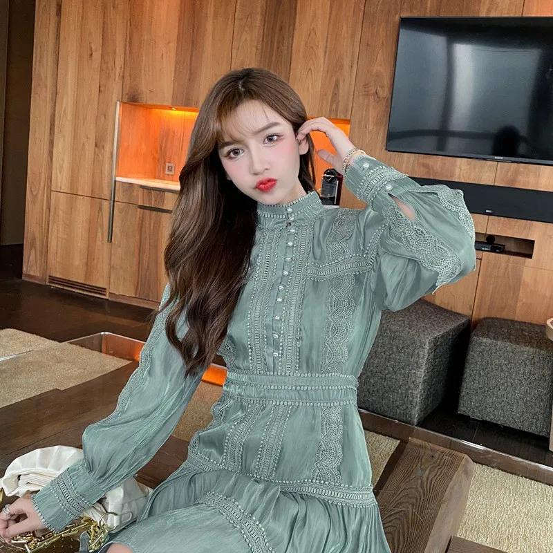 French Light Luxury Puff Sleeve High Waist Slim Midi Dress