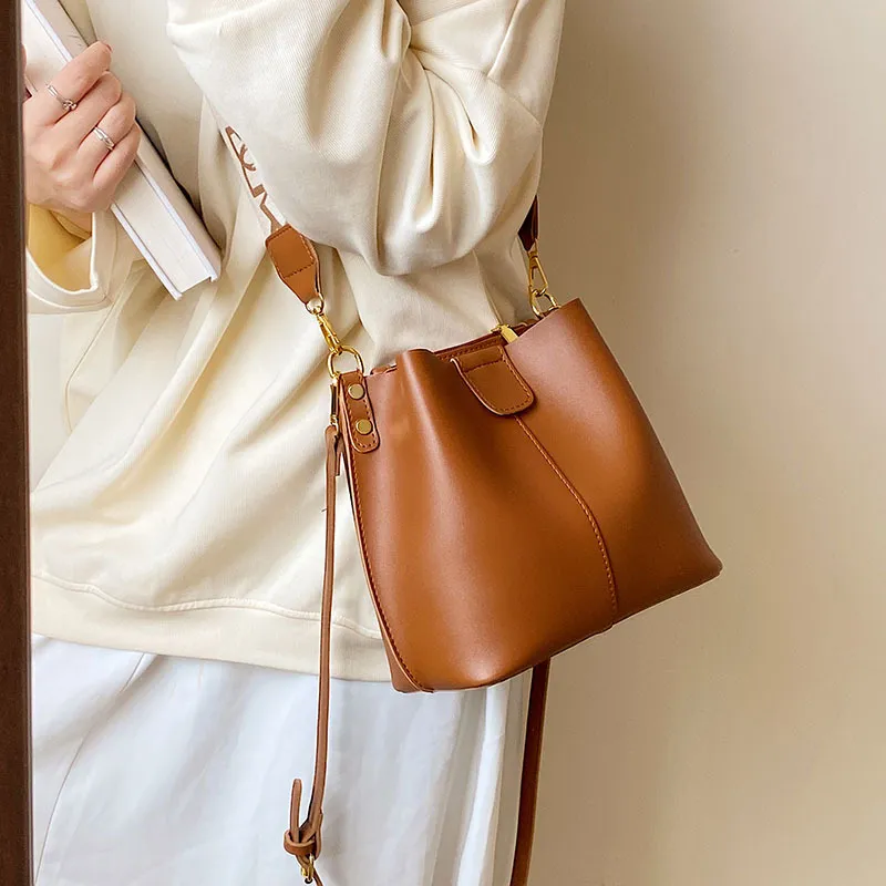French Minority Design Simple Wide Shoulder Strap Bucket Bags Female