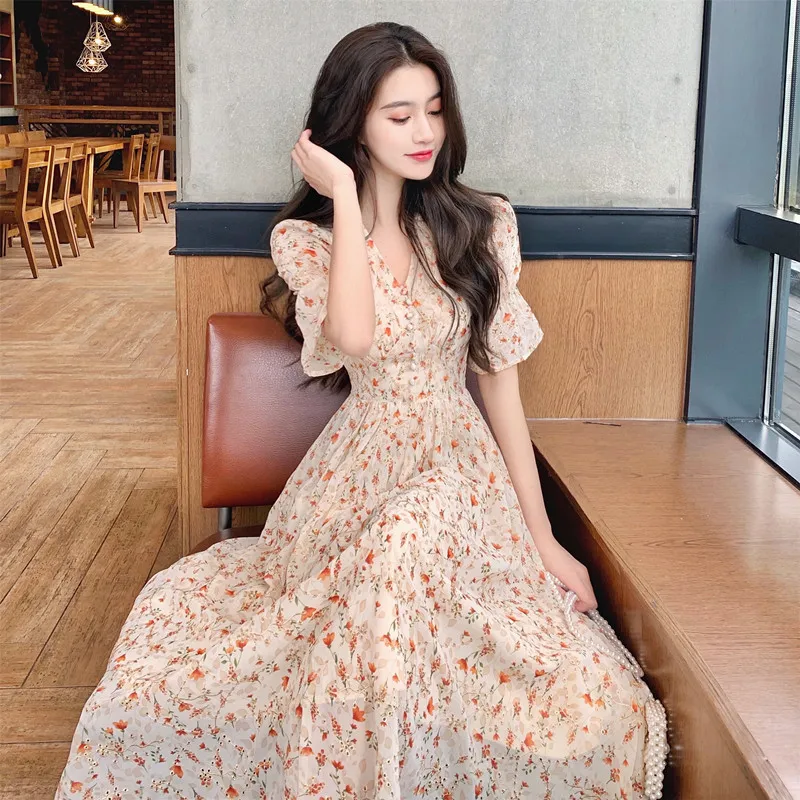 French Style Floral Skirt Puff Sleeve Skirt Long Skirt
