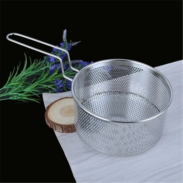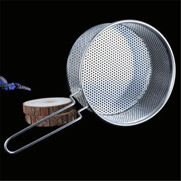 Mesh frying spoons are great for straining food or skimming impurities from broths. The fine mesh allows liquid to drain away easily, making it perfect for lifting foods like fried tempura, small dumplings, or even scooping up food from soups and stews. This type of frying spoon is commonly used in professional kitchens for both frying and general food prep.