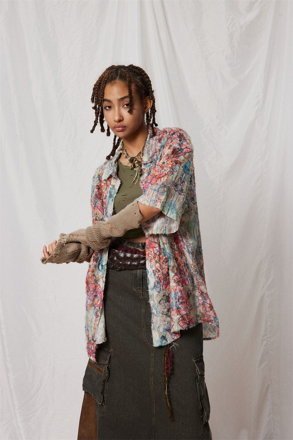 nights. This shirt features a bold, all-over print that captures the essence of summer with its bright colors and dynamic patterns. Made