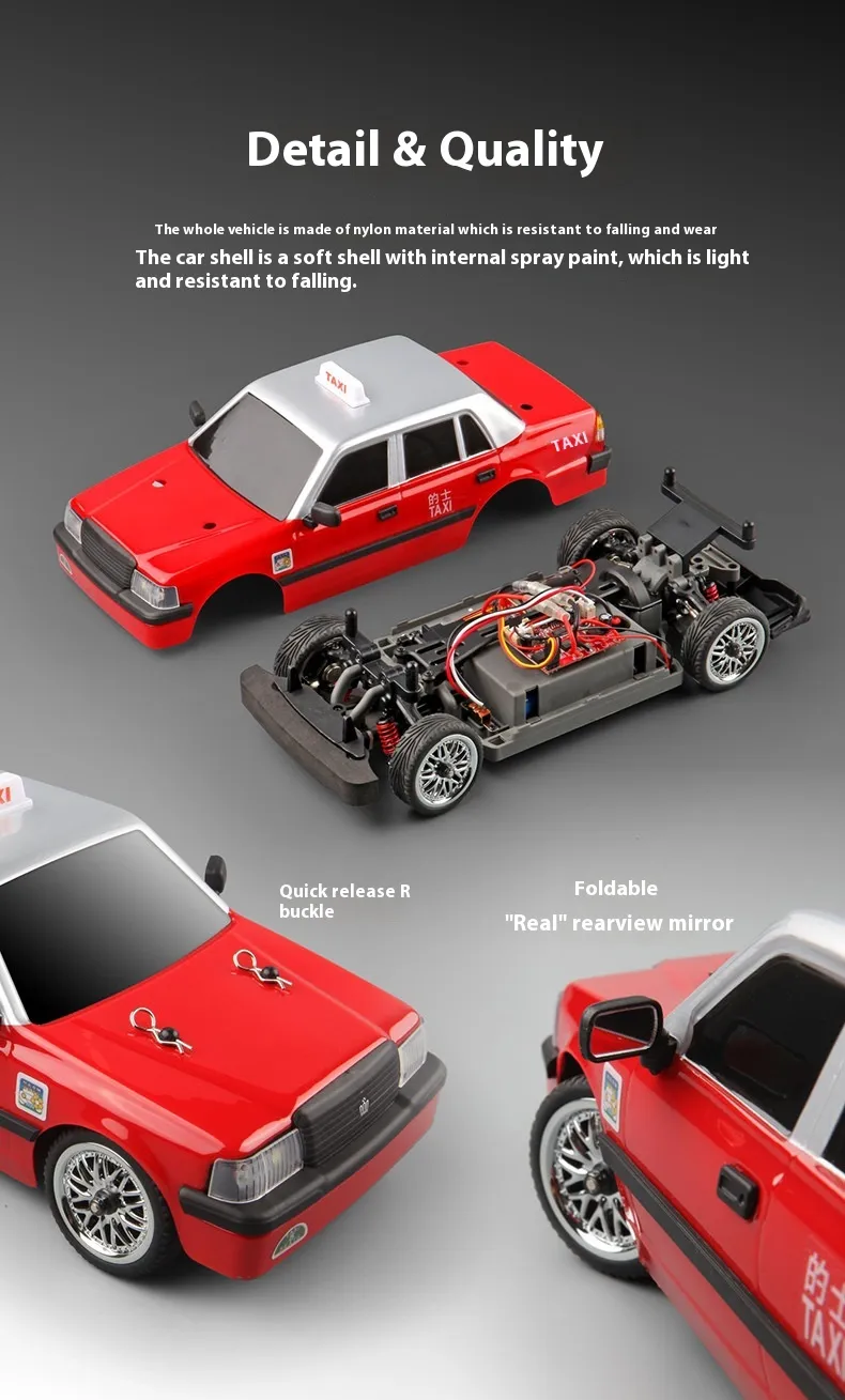 This drift car isn't just about speed—it's about style too. Featuring a full-scale replica of a classic taxi, complete with realistic details such as checkered decals, bright yellow paint, and taxi signage, this car stands out from other RC models. It’s perfect for collectors or anyone who appreciates unique, eye-catching RC cars. Its attention to detail and lifelike design make it a standout piece, whether it’s on display or racing through your local race track.