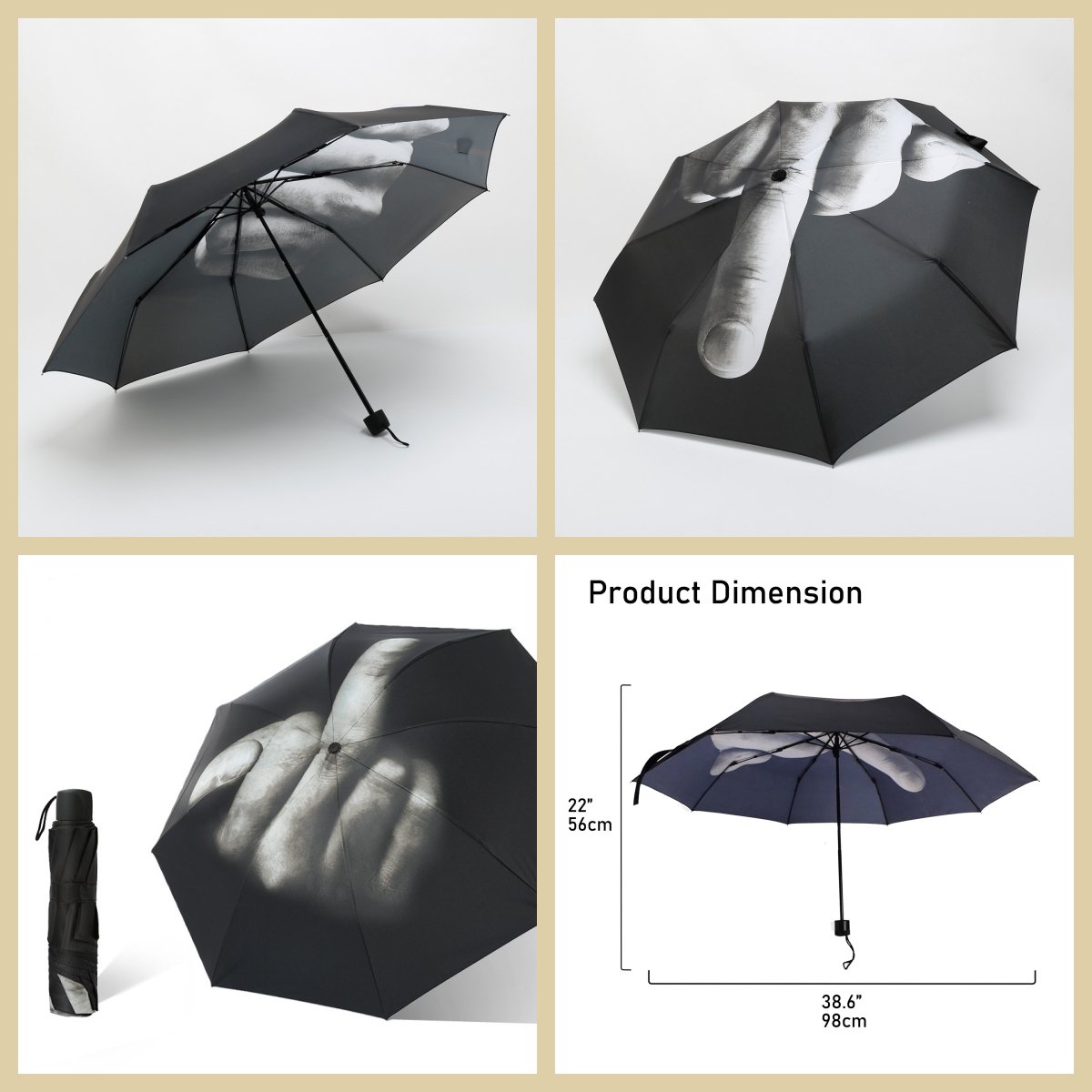 Unique Design:Â This is the middle finger umbrella. You will attract a lot of attention when you use it. Creative and interesting folding umbrella for your life.