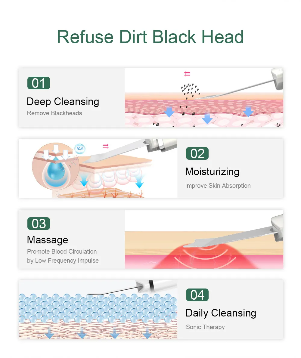 - Ultrasonic Deep Cleansing: High-frequency vibrations remove impurities, blackheads, and dead skin cells from pores.