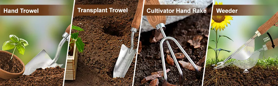 - Complete 4-Piece Set: Includes hand trowel, transplanting spade, weeder, and hand fork, covering a range of gardening needs.