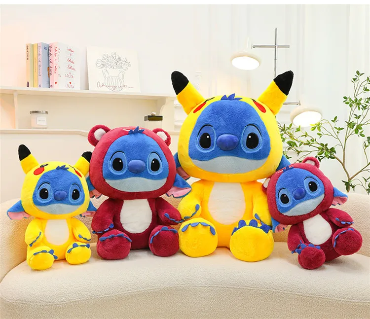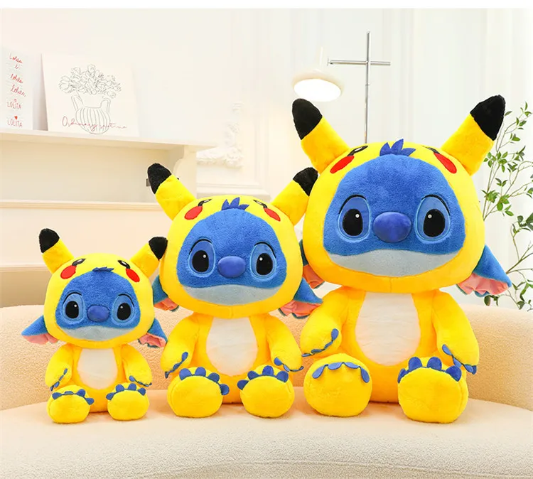 - Color and Material: The doll is crafted from high-quality, ultra-soft plush fabric in vibrant colors. The combination of Stitch’s blue and Pikachu’s yellow, along with the strawberry bear’s rosy accents, creates a visually striking and inviting plush toy.