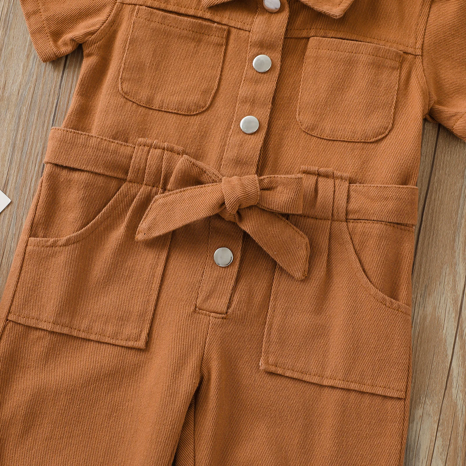 This jumpsuit features a classic lapel collar, adding a touch of sophistication to your child's casual wardrobe. The sleek, tailored cut combined with the trendy design elements, such as the button-up front and practical side pockets, gives this jumpsuit a chic, modern look. The versatile design can easily be dressed up or down, making it a must-have for both casual outings and dressier occasions.