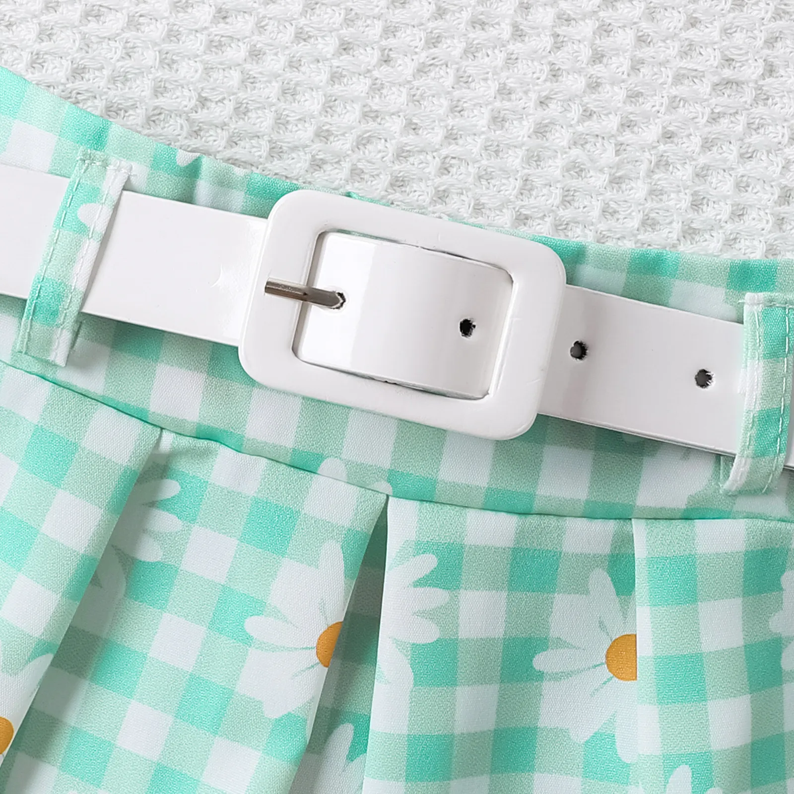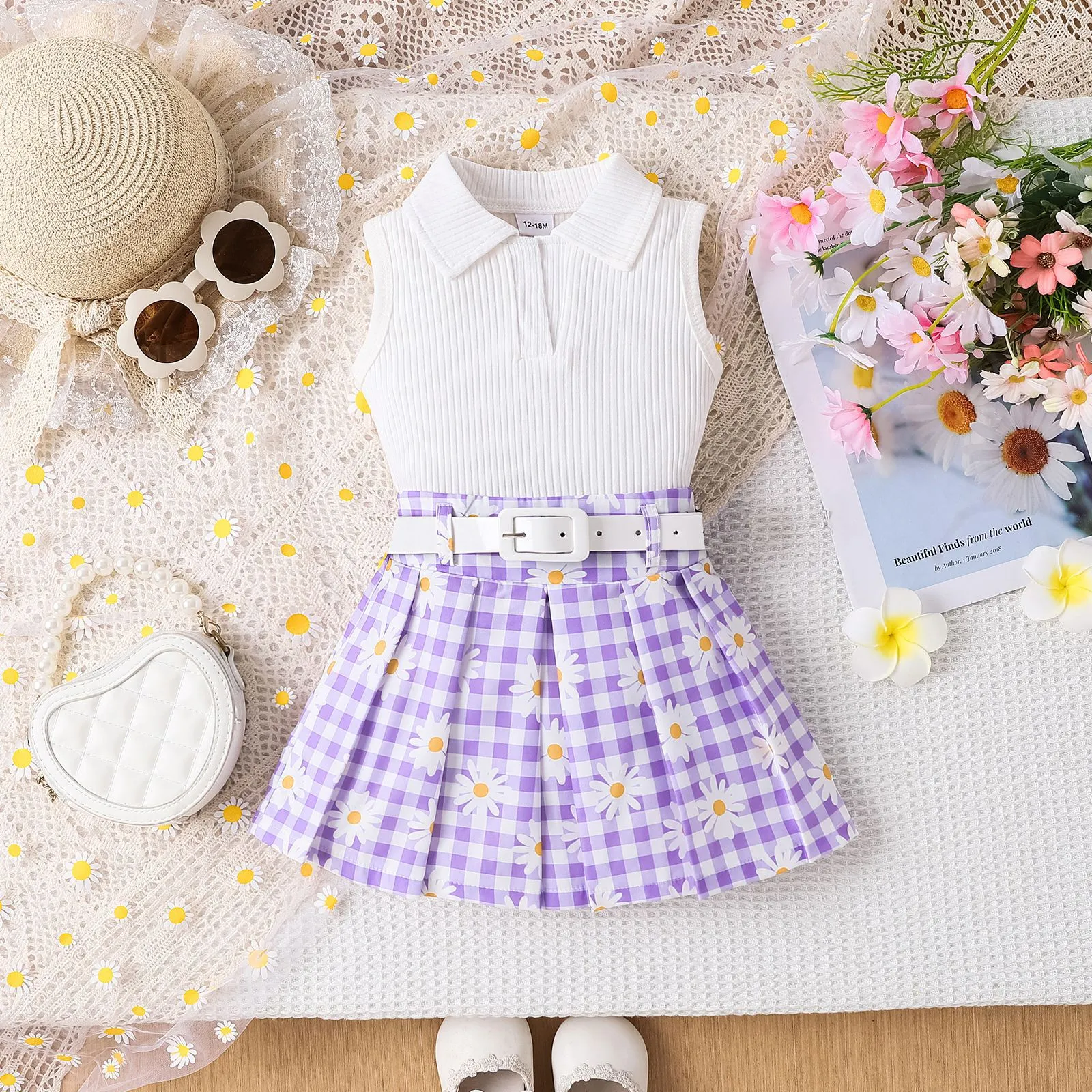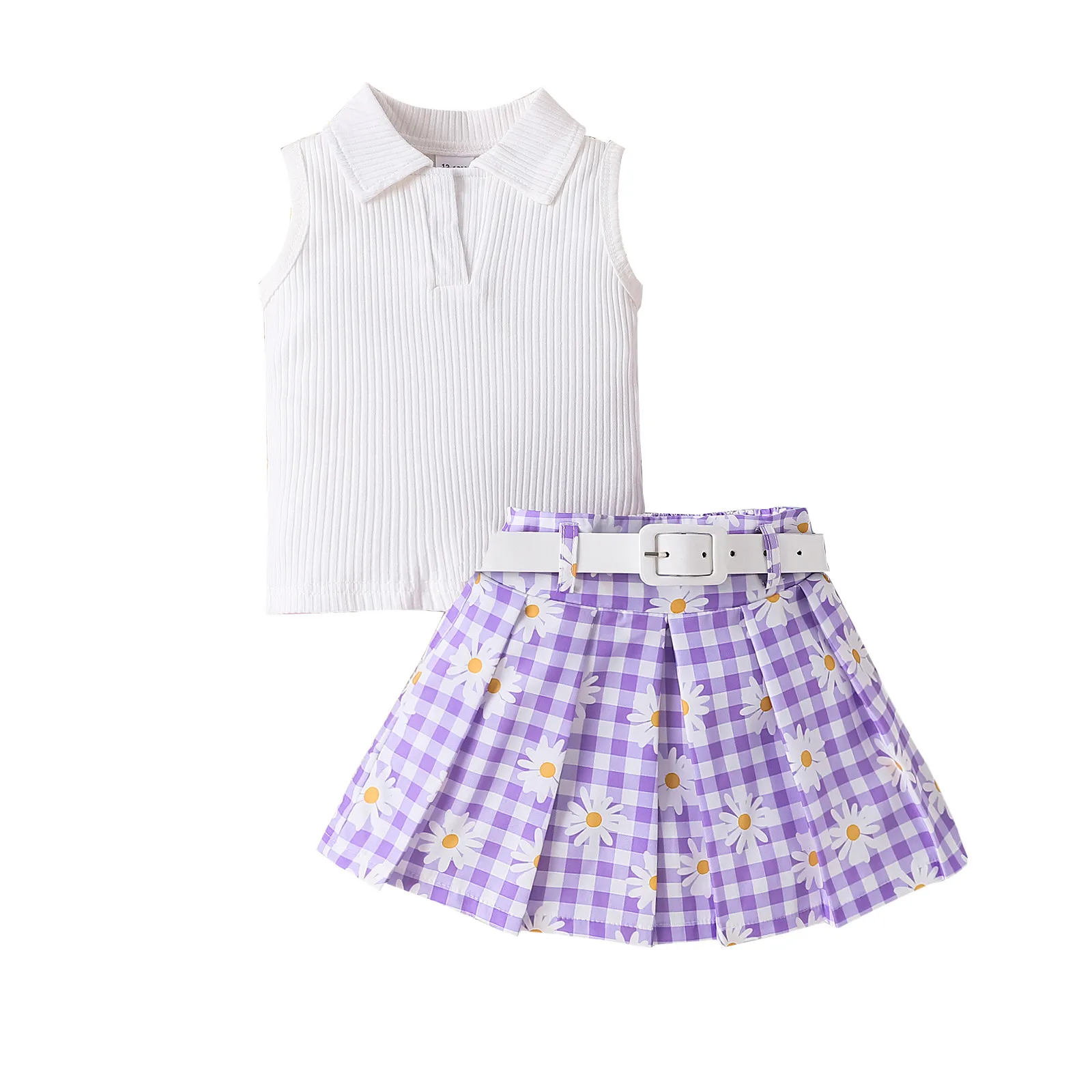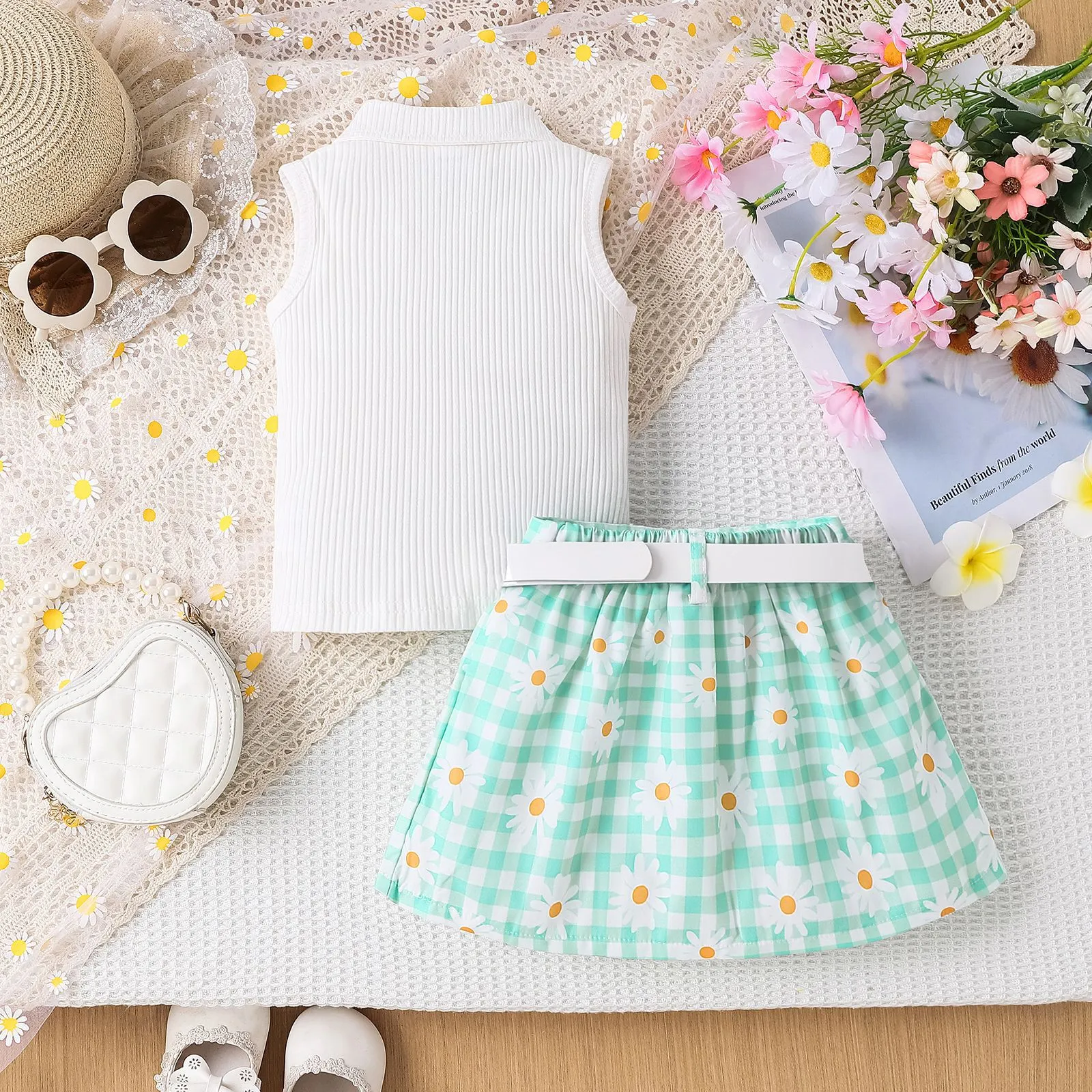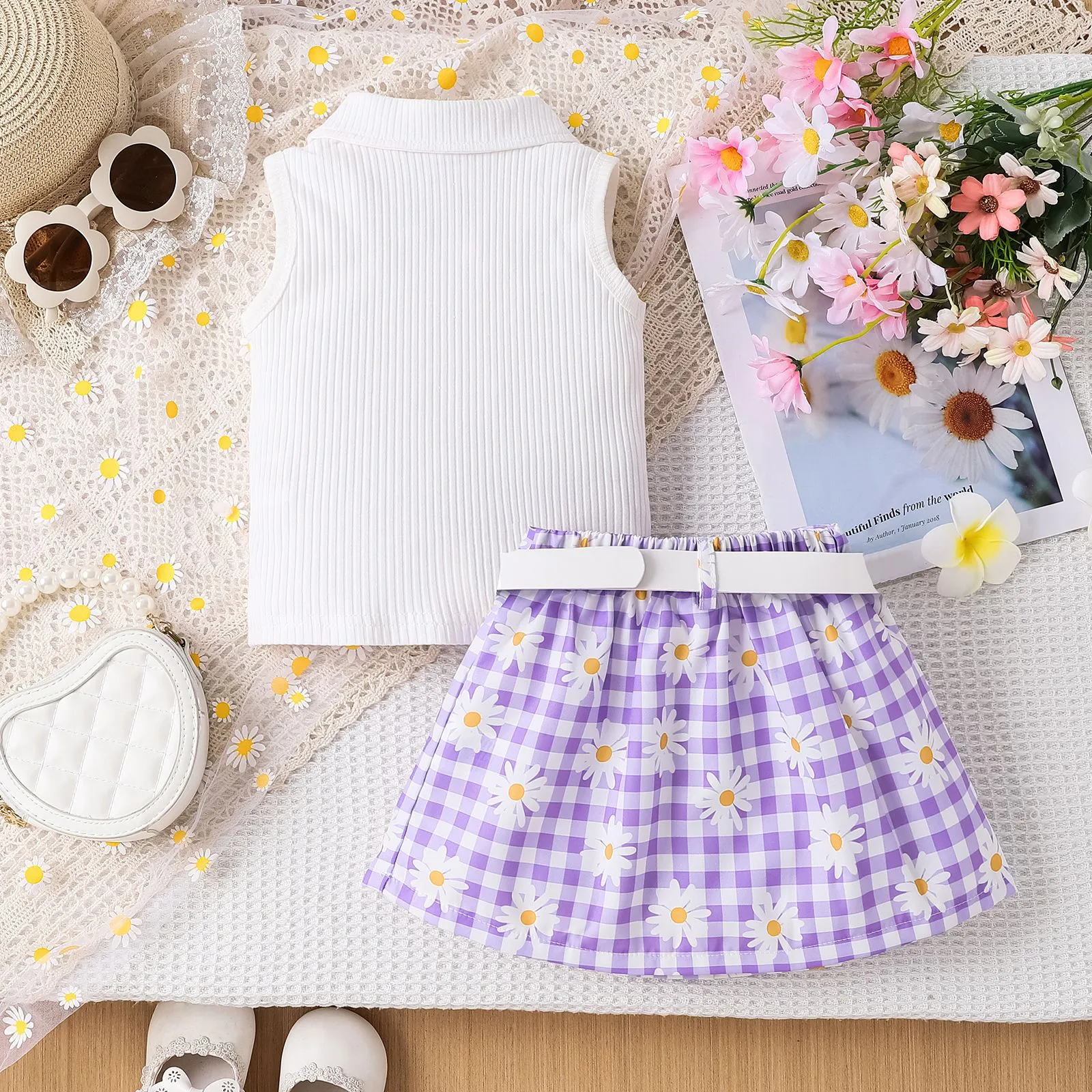 Girls' Suit Sleeveless Sunken Stripe Top with Daisy Plaid Skirt Belt Three-piece Suit: Stylish and Comfortable Fashion for Little Girls