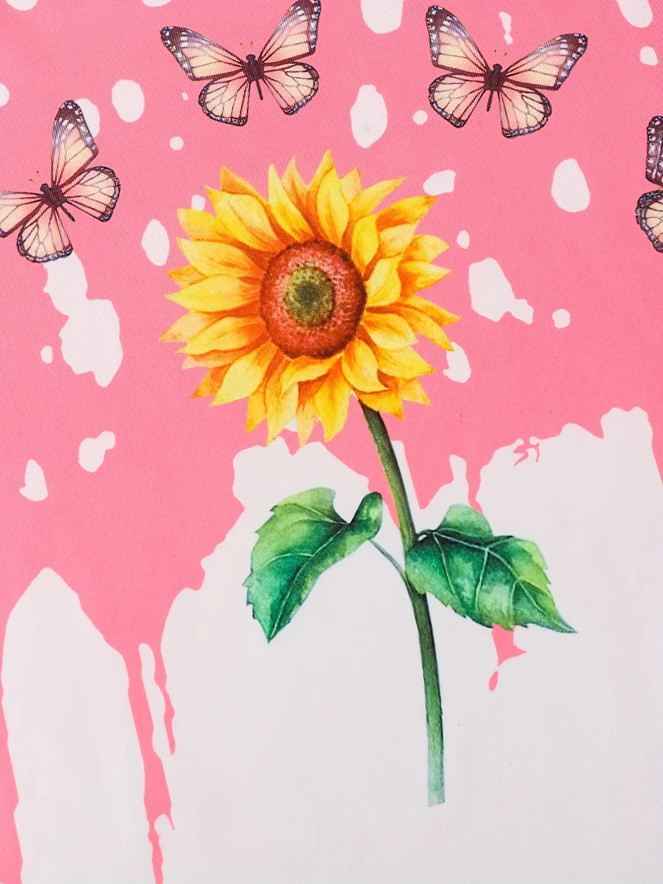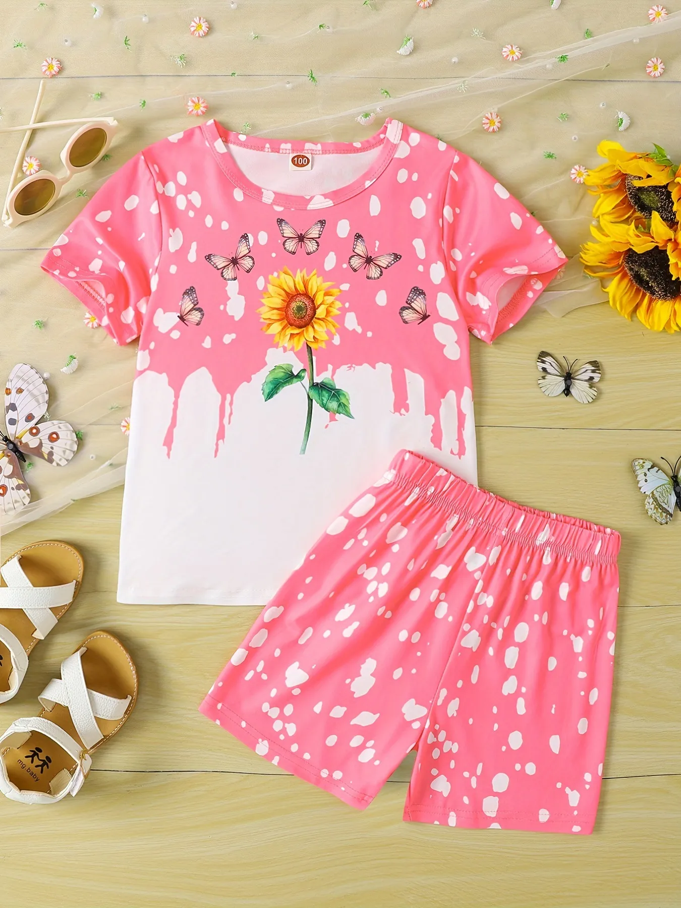 Girls Sunflower And Butterfly Pattern Short Sleeve Top Shorts Suit
