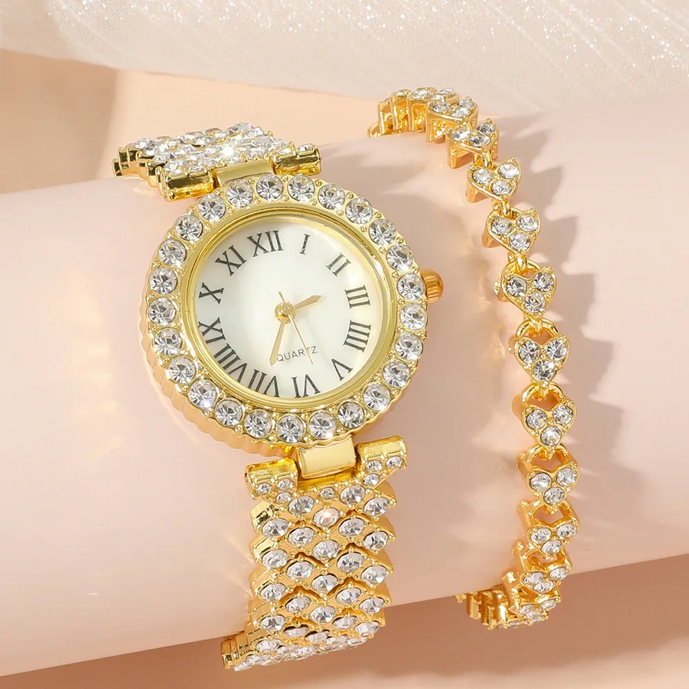 - Elegant Design: The watch features a dazzling array of rhinestones that encircle the dial, creating a breathtaking sparkle that catches the eye. The matching bracelet and necklace are adorned with delicate details, enhancing the overall aesthetic.