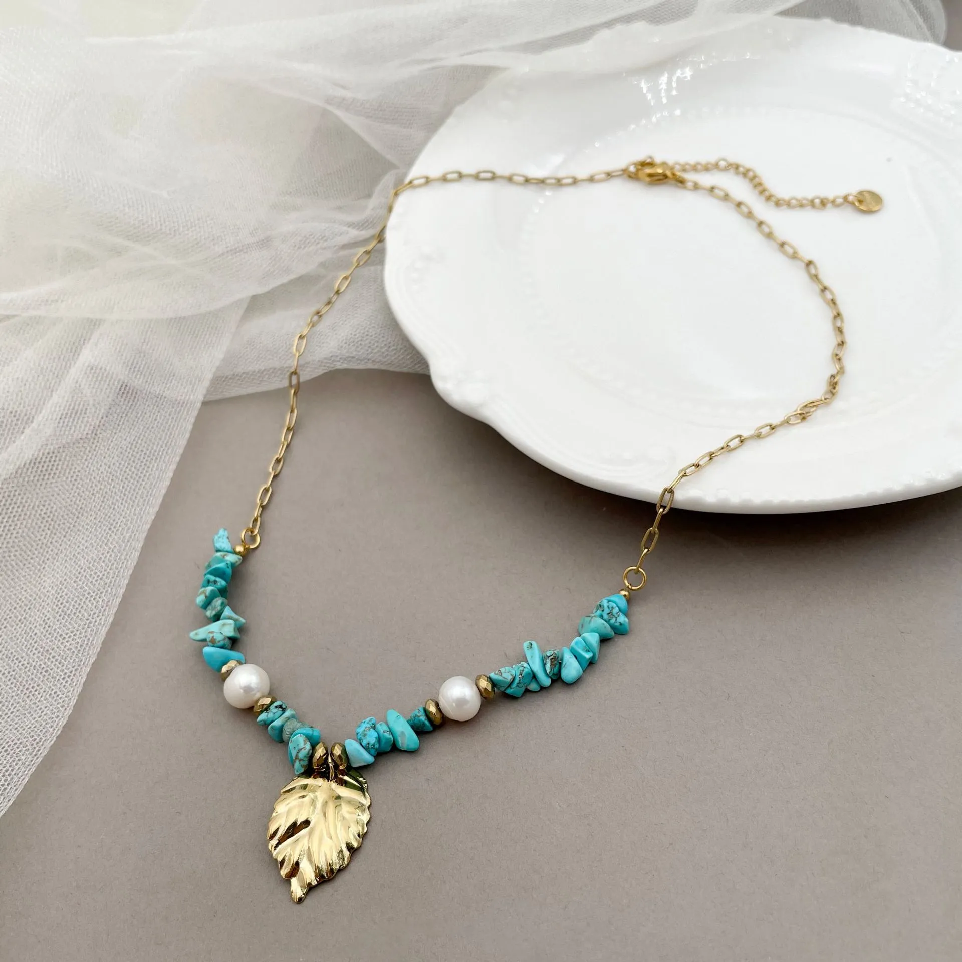 Gold Blue Natural Stone Leaf Pendant Freshwater Pearl Necklace: A Timeless Blend of Elegance and Nature