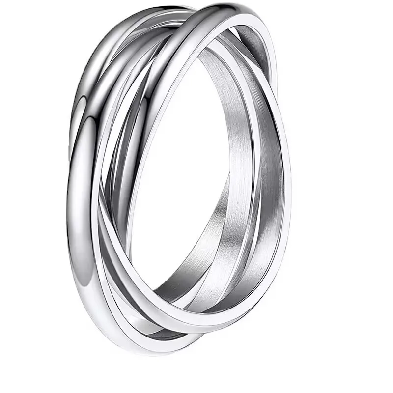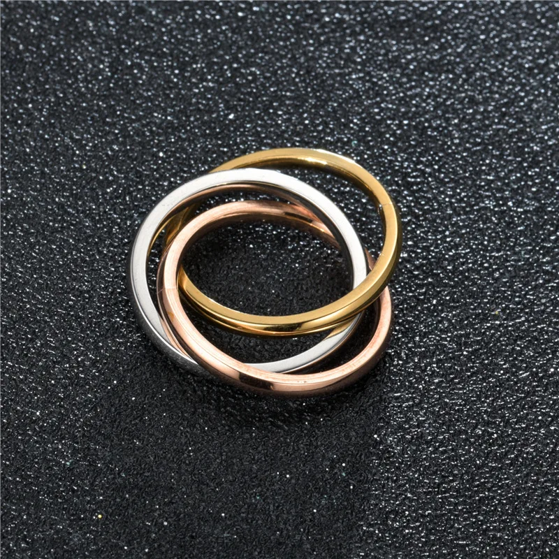 The 2024 hot selling gold-plated stainless steel women's three-color three-ring interlocking stacked couple ring is a