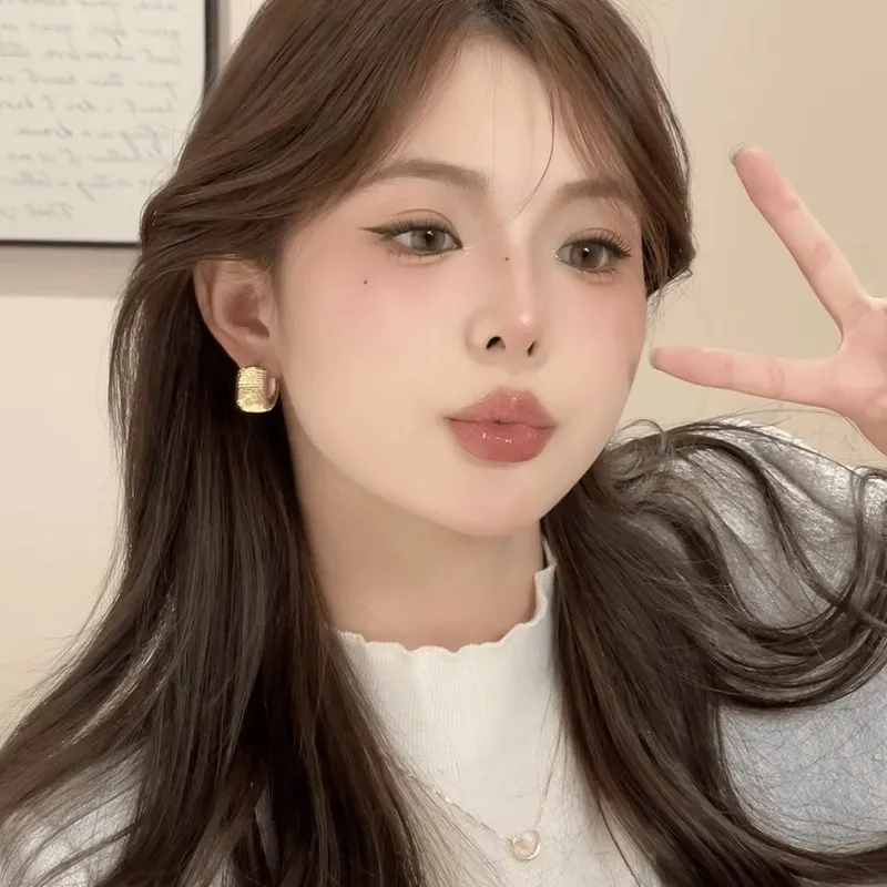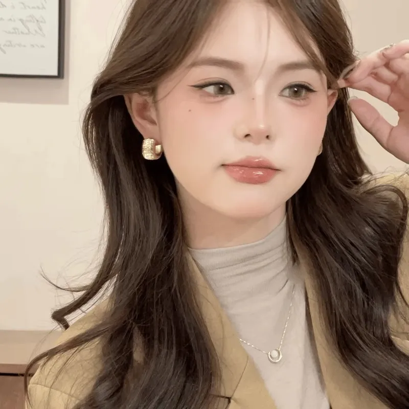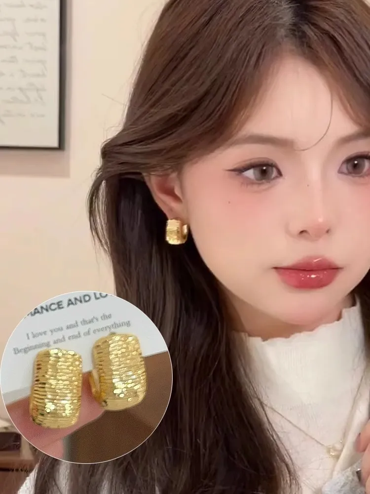Gold-plated Striped Wide Face Ring Ear Button Earrings High Sense