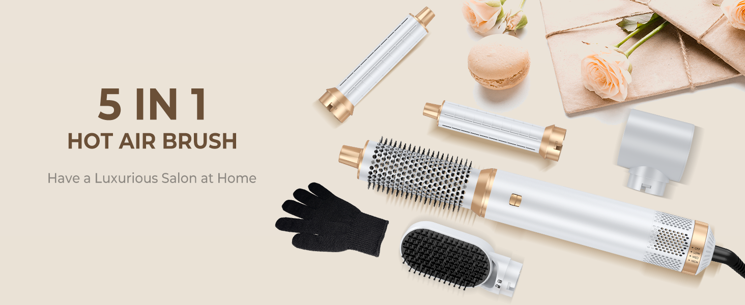- UPGRADE HOT AIR BRUSH: Powerful 5 in 1 curling brush set airflow blows out from the air curler attachment, continuously forming a clockwise surrounding airflow around the curler, Enhanced Coanda effect, makes hair automatically adhere to the surface, for clockwise and counterclockwise curls. Creates voluminous, smooth, and natural curls without extreme heating, creating hassle-free curls in seconds. 5 in one hot air brush set meet all your style needs, be the most shining queen.