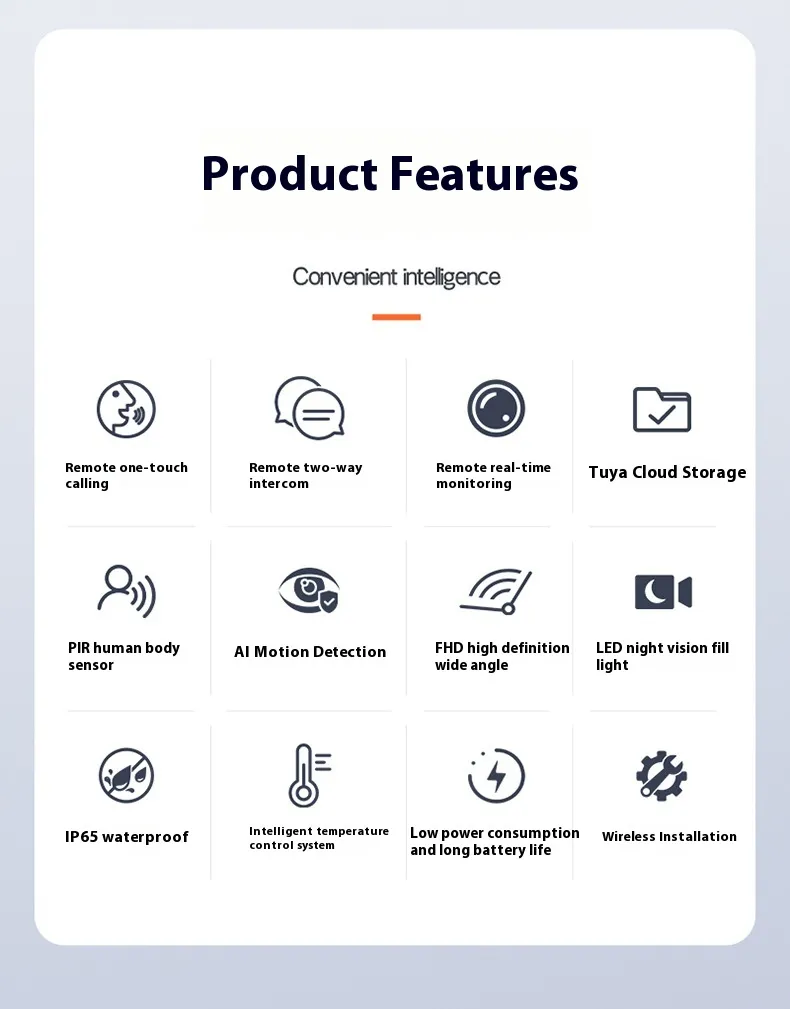 Specifications: M18/Tuya/high-end version/IP65 Waterproof/remote awaking/PIR human body induction/AI motion detection/duplex intercom