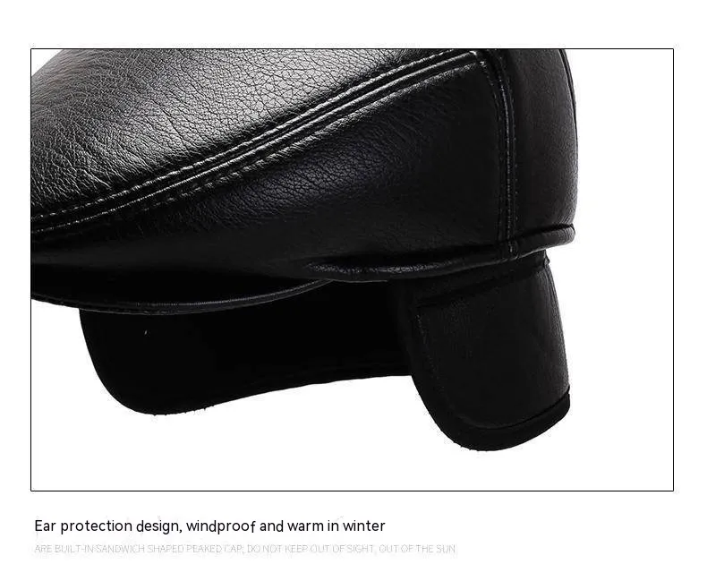 Grandpa Leather Hat Men's Autumn And Winter Fleece-lined Warm Leisure PU Ears Protection Peaked Cap
