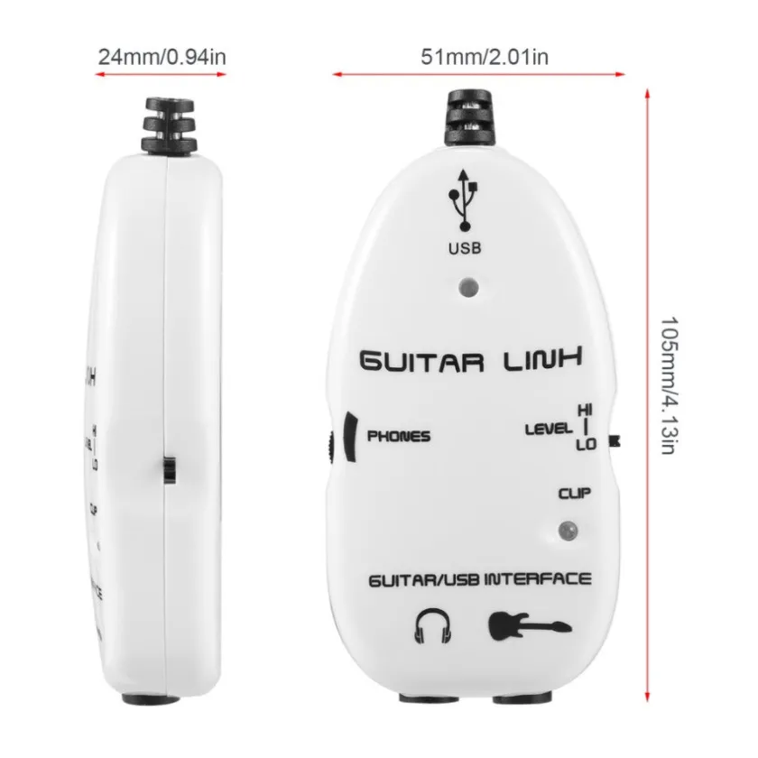 The Guitar to USB interface is a device designed to connect your electric guitar directly to a computer or digital audio workstation (DAW) via a USB port. This tool allows you to record, process, and edit guitar sounds on your computer without the need for traditional amplifiers or audio interfaces. It effectively converts the analog guitar signal into a digital signal, making it perfect for home recording, online tutorials, or playing virtual instruments with minimal setup.