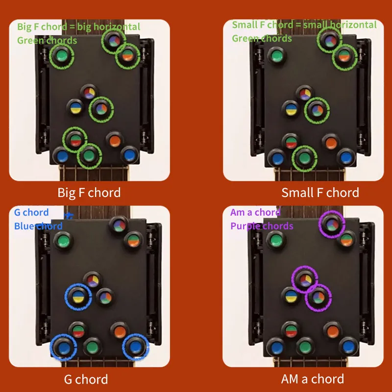 The chord learning tool can help you to learn the chords by the different colors button, easy to remember, no pain for your finger. It owns