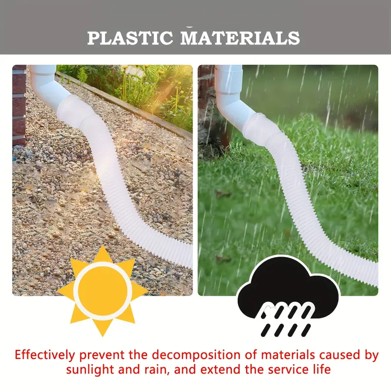 The ownspout Extension is constructed from durable plastic that is resistant to tearing and breaking, allowing for easy adjustment of the pipe's length. Our downspout extension connector can be conveniently extended from 47cm to 150cm. The rainwater drainage pipe features a split design, which is both retractable and detachable, making it flexible enough to navigate around obstacles while maintaining its shape.The downspout drain extender is compatible with various pipes and standard drain tiles, helping to maintain cleaner yards and gardens while protecting your foundation from damage. Installation is straightforward: first, extend the rain gutter attachment to the desired length; then, twist both ends onto the connecting pipe; next, attach the under gutter nozzle adapter to the drain pipe; and finally, fasten it to the drain pipe using screws.Dimensions Guide: length: 47cm-150cm/18.50inch-59.06inch Contents of the Package: 1 Downspout Extension 2 Tube Heads 2 Screws