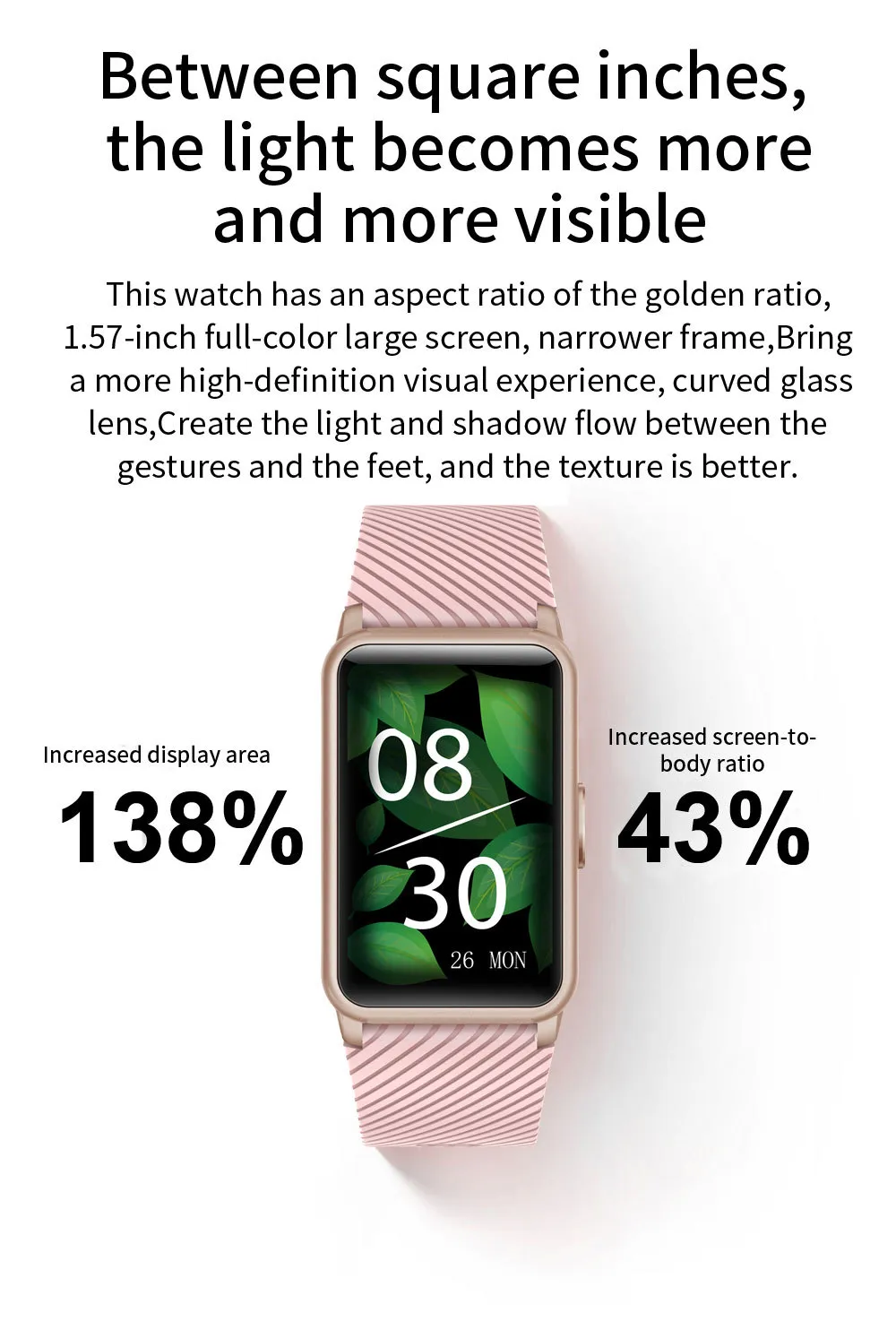 The H96 Smart Bracelet features a 1.57-inch color touchscreen display, providing clear and vibrant visuals. The touch interface ensures smooth navigation through different functions and makes it easy to check notifications, track activity, or monitor health metrics.