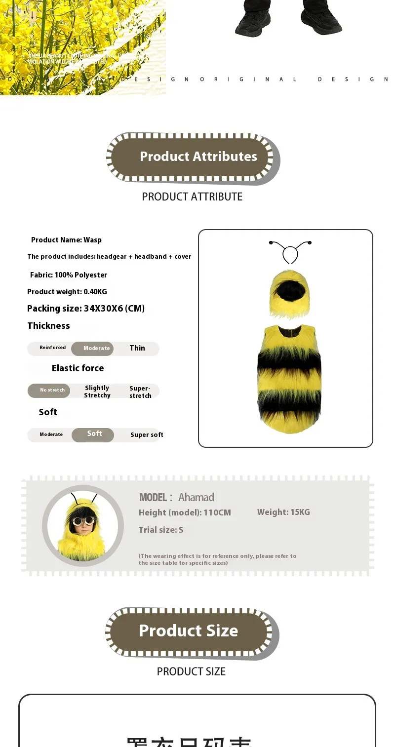 Perfect for Halloween events, themed birthday parties, school performances, or dress-up days, this bee costume sparks imagination and lets kids embrace their playful side. With its soft fabric, durable stitching, and realistic bee design, it’s the perfect combination of charm and practicality — buzzing with joy and excitement!