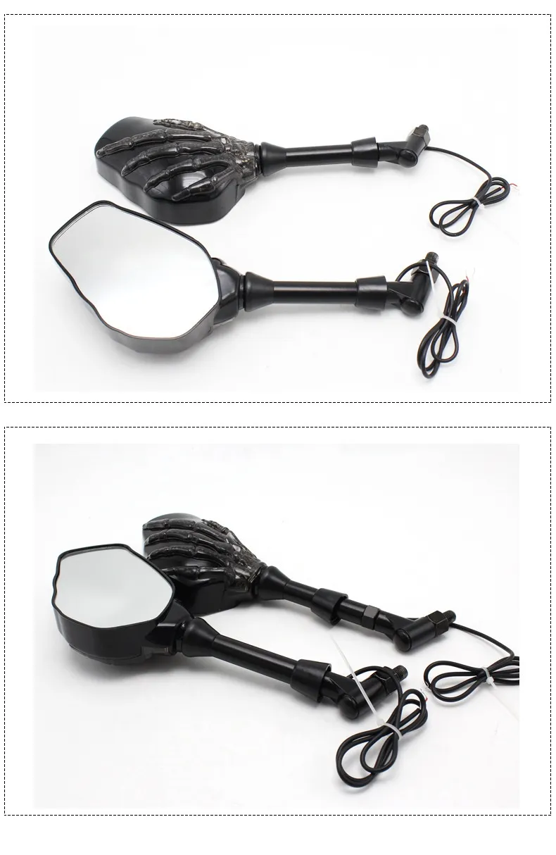The LED light reflector is easy to install and compatible with most motorcycle models, making it a hassle-free upgrade for your ride. It’s powered by energy-efficient LED lights that are bright yet low on power consumption, offering long-lasting performance without draining your battery. The durable construction ensures that this rearview mirror modification can withstand the elements, from rain to wind, making it a great option for outdoor use. Whether you're riding to a Halloween event or just want to show off your unique style, this skull hand ghost claw LED light reflector is the perfect addition to your motorcycle.