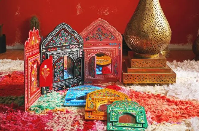 This mirror combines the functionality of a makeup mirror with the stylish, eclectic elements of boho chic decor. Its wooden frame is hand-painted with vibrant, intricate patterns and motifs, making each piece a one-of-a-kind work of art. The door-inspired design adds a rustic touch, while the large reflective surface ensures practicality for daily use.