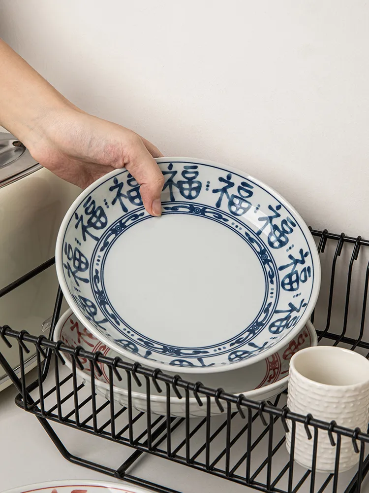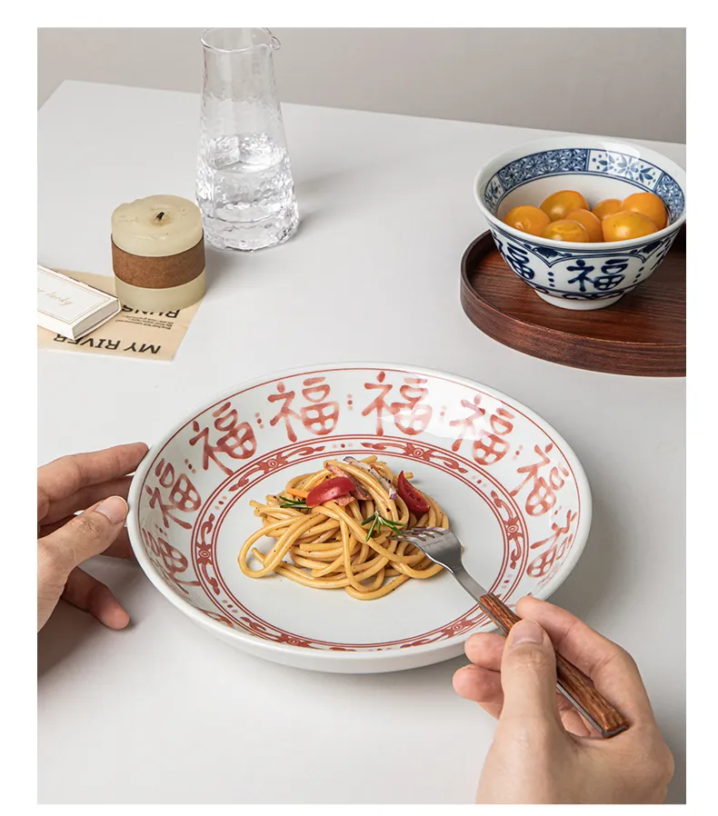 Color classification: fu character Blue-8 inch round deep plates, Fu character Red-8 inch round deep plates