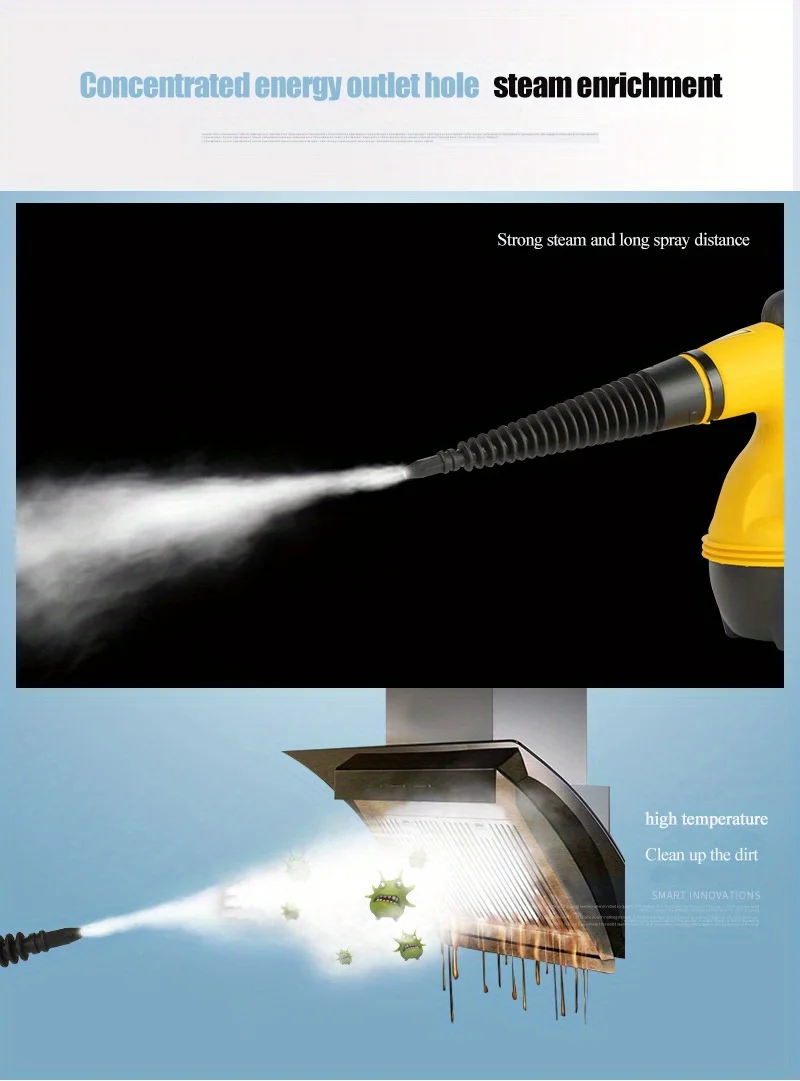 vehicle. Ideal for kitchen range hoods, bathrooms, car interiors, and more, this portable steam cleaner provides high-temperature steam that