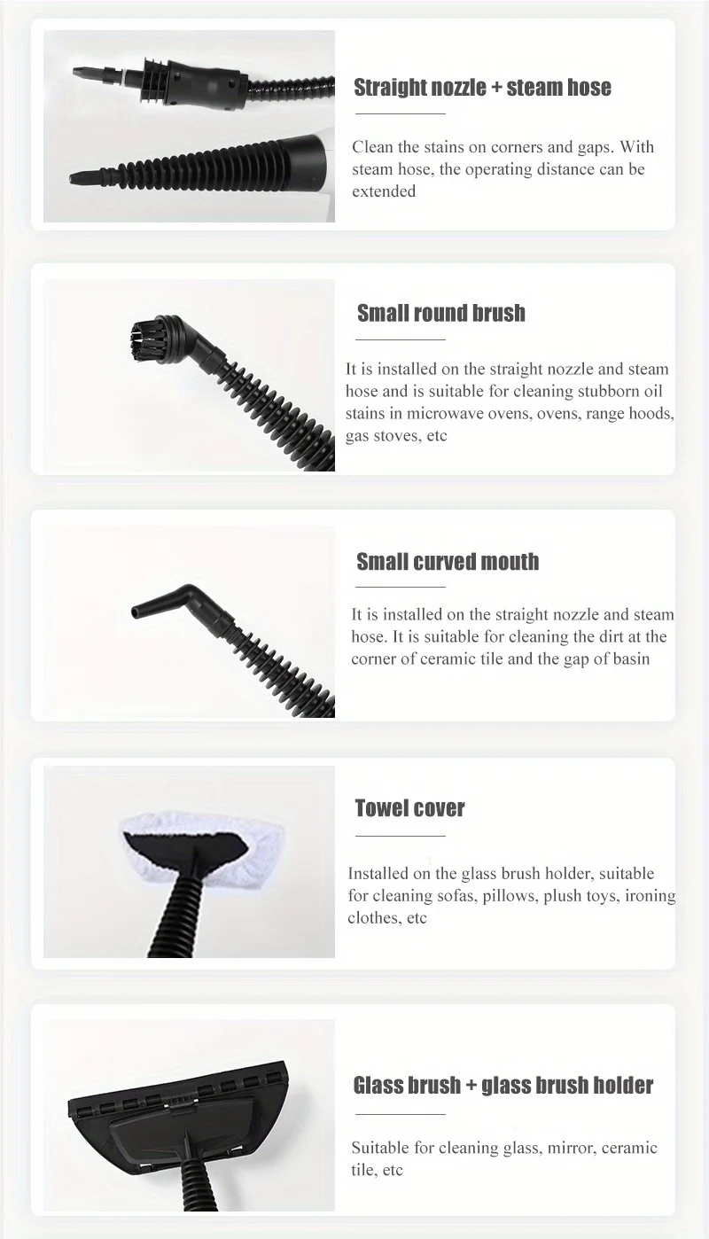 This steam cleaner includes various attachments to adapt to different cleaning needs and surfaces. Whether you need to clean the range hood