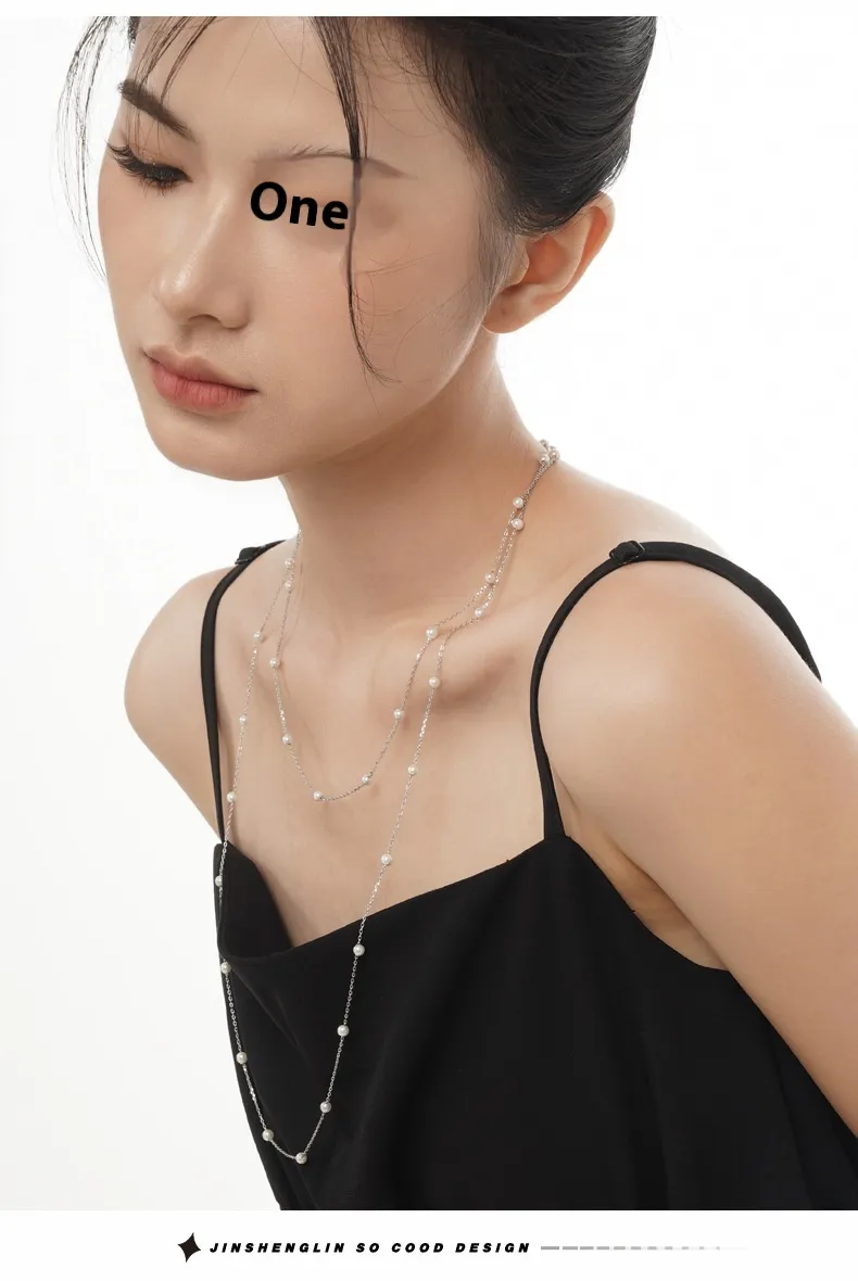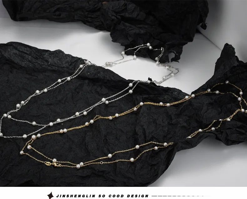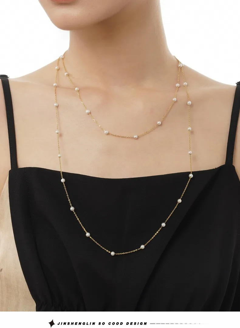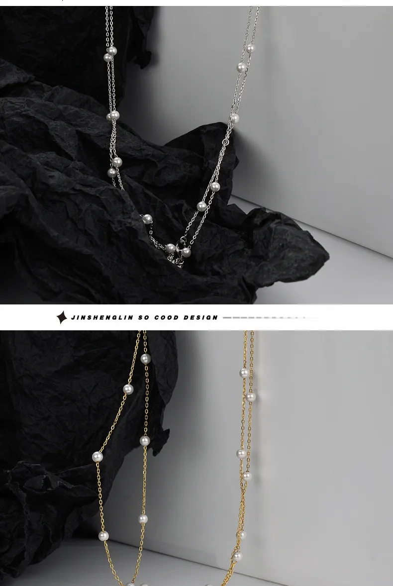 Handmade S925 Sterling Silver Shell Pearls Necklace Twin Beads Sweater Chain