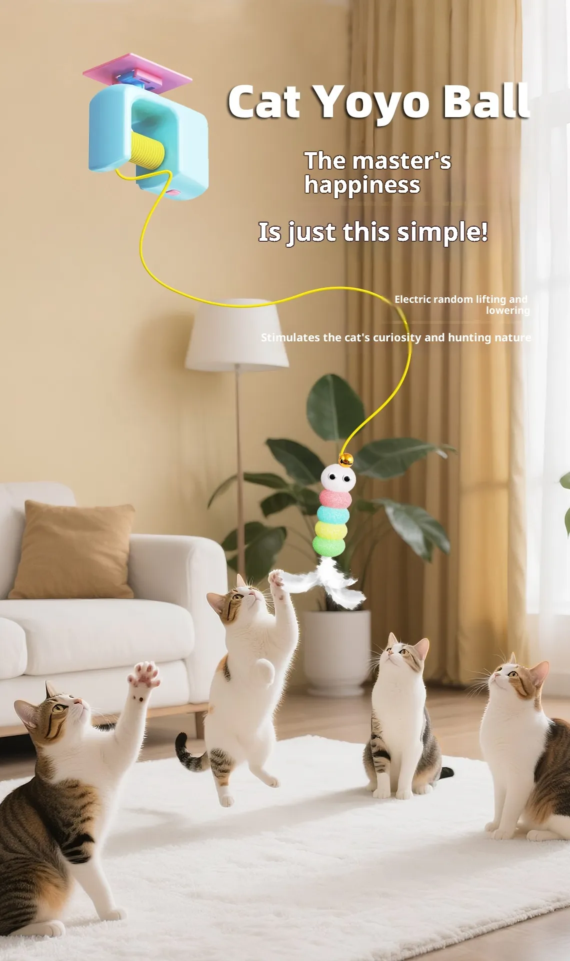 【Adjustable Elastic Cord 】 Smart, Flexible Setup, This hanging cat toy features a stretchable cord that adjusts to different heights—so your cat can switch up the challenge or keep things fresh. The built-in smart sensor means your cat is in control. The moment they touch it, the toy comes alive—spinning, swinging, teasing. Whether you’re working, cooking, or relaxing, your furry friend stays active, happy, and occupied.