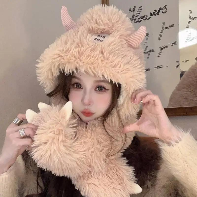 Hat And Scarf Integrated Cartoon Versatile Plush Ear Protection