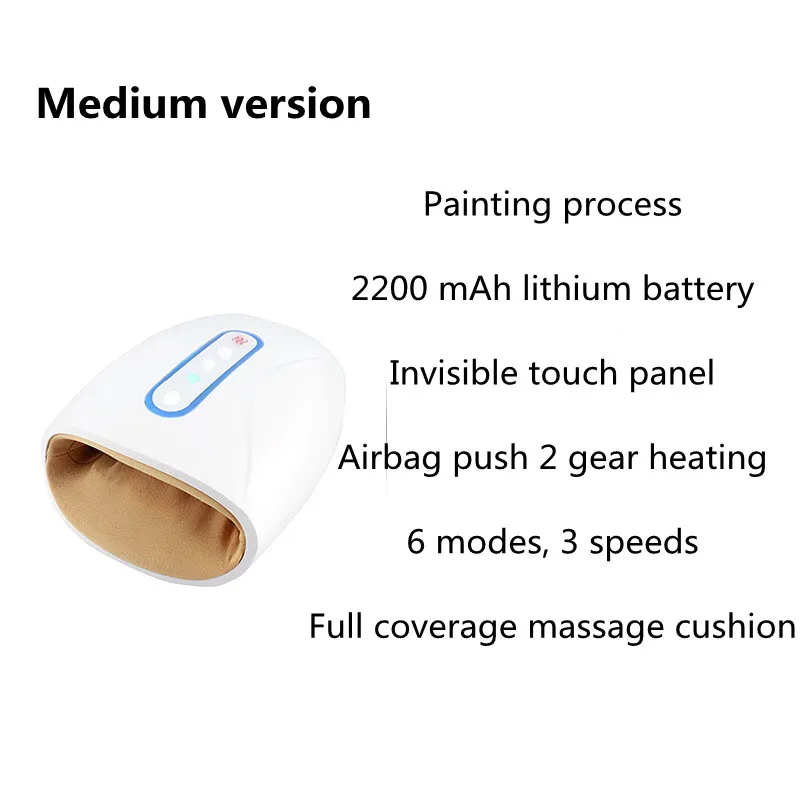 High version: spray painting process, 2200 mAh lithium battery, invisible touch panel, airbag pushing 2 speeds, 6 modes and 3 speeds, independent finger massage breathing light.