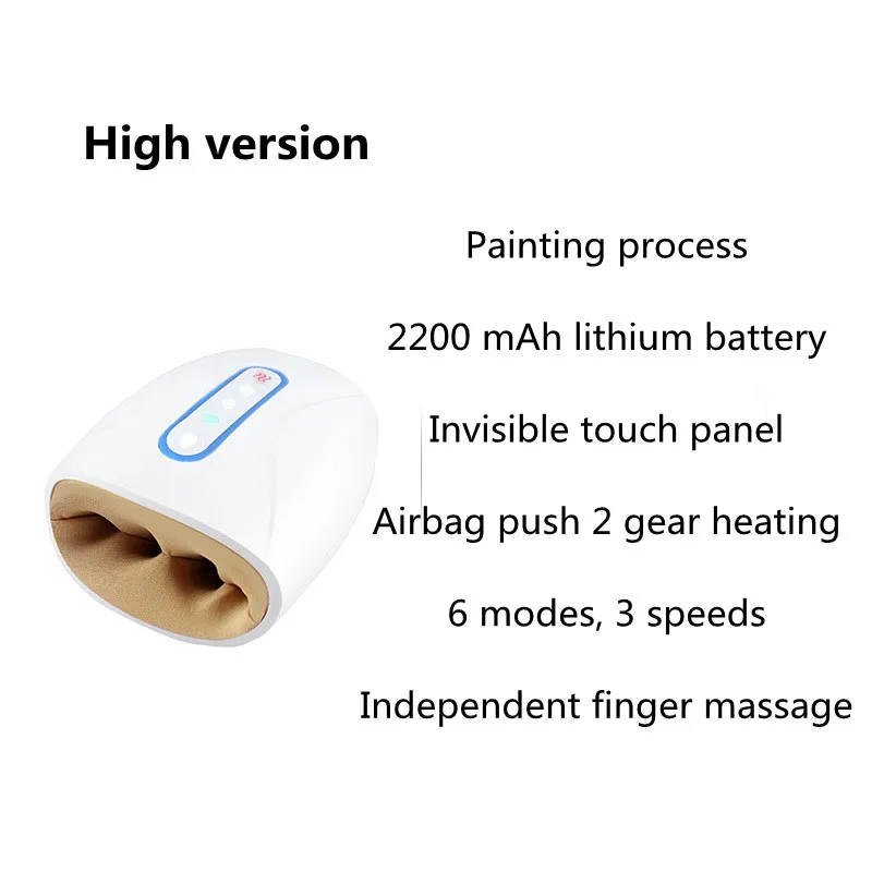 High version: spray painting process, 2200 mAh lithium battery, invisible touch panel, airbag pushing 2 speeds, 6 modes and 3 speeds, independent finger massage breathing light.