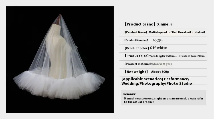 In conclusion, the Heavy Industry Ruffled Bridal Veil is an exquisite choice for brides who want to make a statement while maintaining an air of elegance and grace. With its luxurious double-layer design, dramatic ruffled edges, and soft, airy texture, this veil adds volume, beauty, and sophistication to your bridal look. Whether for an indoor studio photoshoot, an outdoor wedding, or a travel destination celebration, this veil ensures you look stunning and unforgettable on your special day.