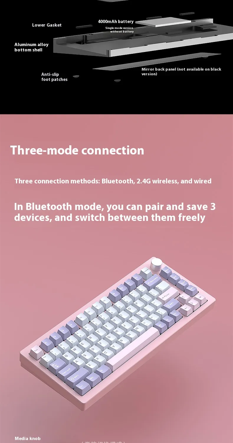 This versatile keyboard supports wired, wireless, and Bluetooth connections, giving you maximum flexibility across multiple devices such as PCs, laptops, and tablets. Switch between modes seamlessly to suit your workspace, gaming setup, or mobile needs.
