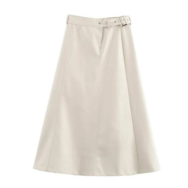 High Waist Pure Color With Belt A- Line Faux Leather Midi Skirt Skirt