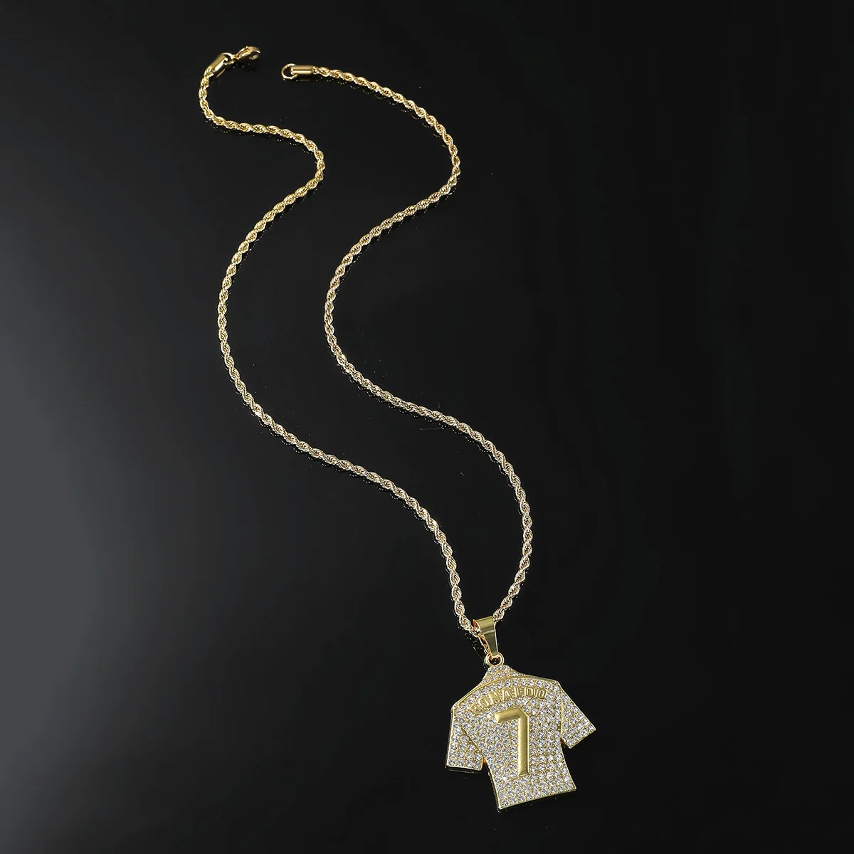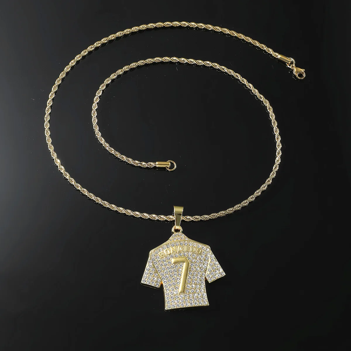 The pendant replicates Cristiano Ronaldo’s jersey with intricate details and sparkling zircon stones.