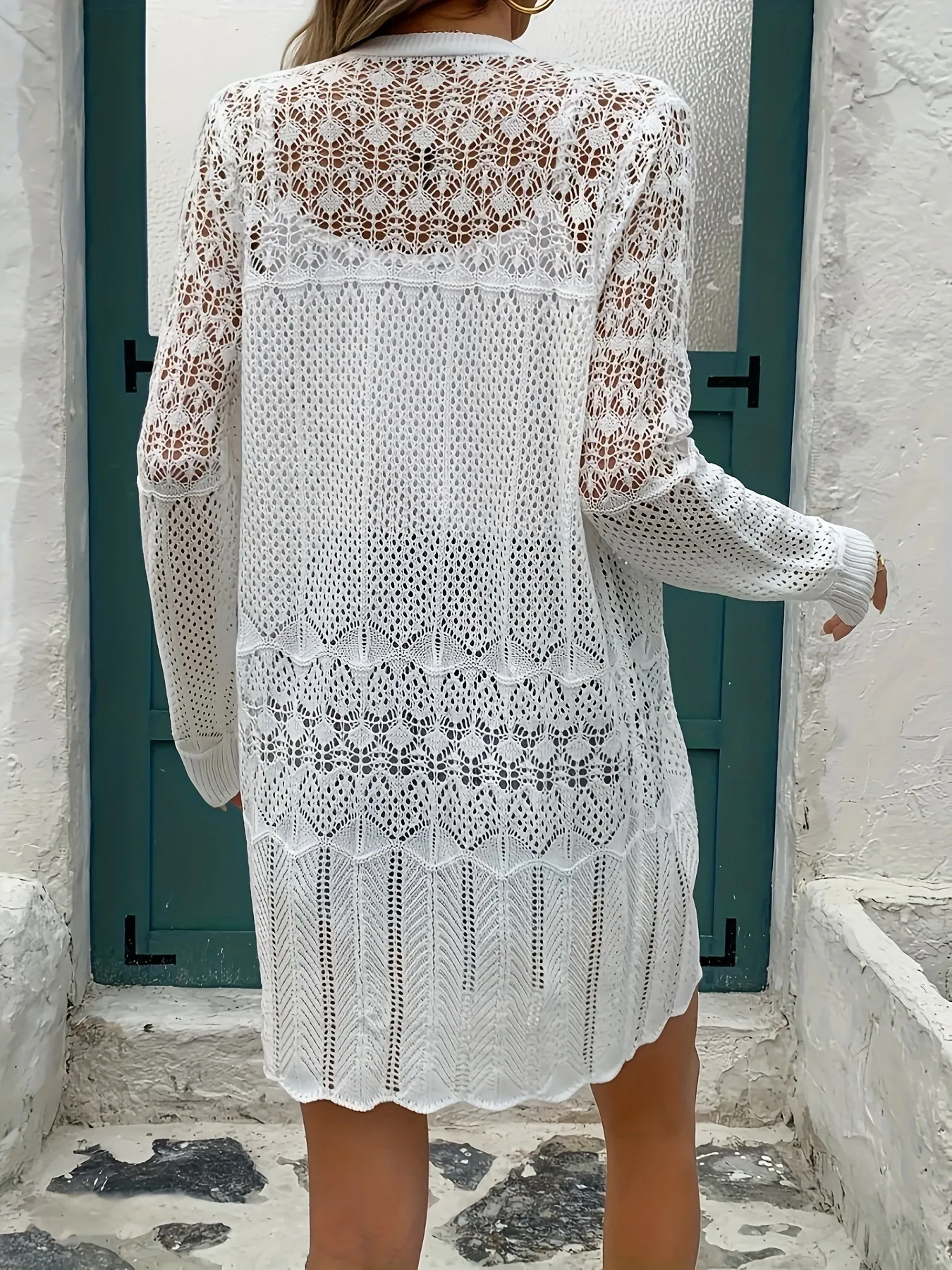Whether you're layering it over your favorite summer outfit for sun protection or wearing it as a stylish warm layer in cooler months, the Hollow-out Long-sleeved Knitted Cardigan keeps you feeling chic and comfortable no matter the occasion.