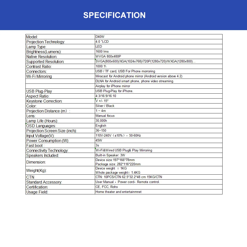 Thanks to advanced technology, the Home HD Projector provides clear, crisp images with rich colors, even in rooms with ambient light. With easy-to-use features and multiple connectivity options, you can quickly set up the projector and enjoy your favorite content on a large, vibrant screen.